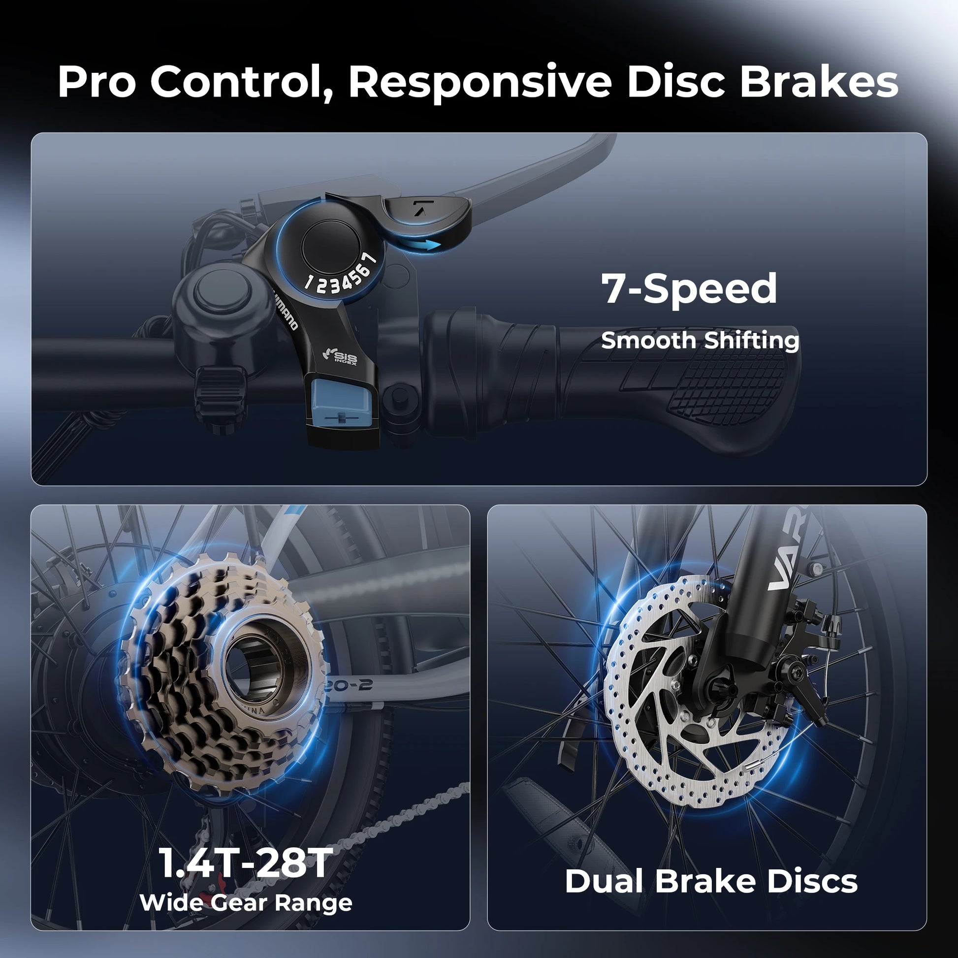 Switch effortlessly between 4 riding modesโNormal, Pure Electric, Pedal Assist, and Cruise Modeโto match your needs. The 7-speed gearbox and responsive disc brakes ensure smooth and safe control, while comfort upgrades like 20-inch puncture-resistant tires, an easy-to-read LED display, and adjustable handlebars make every ride more enjoyable