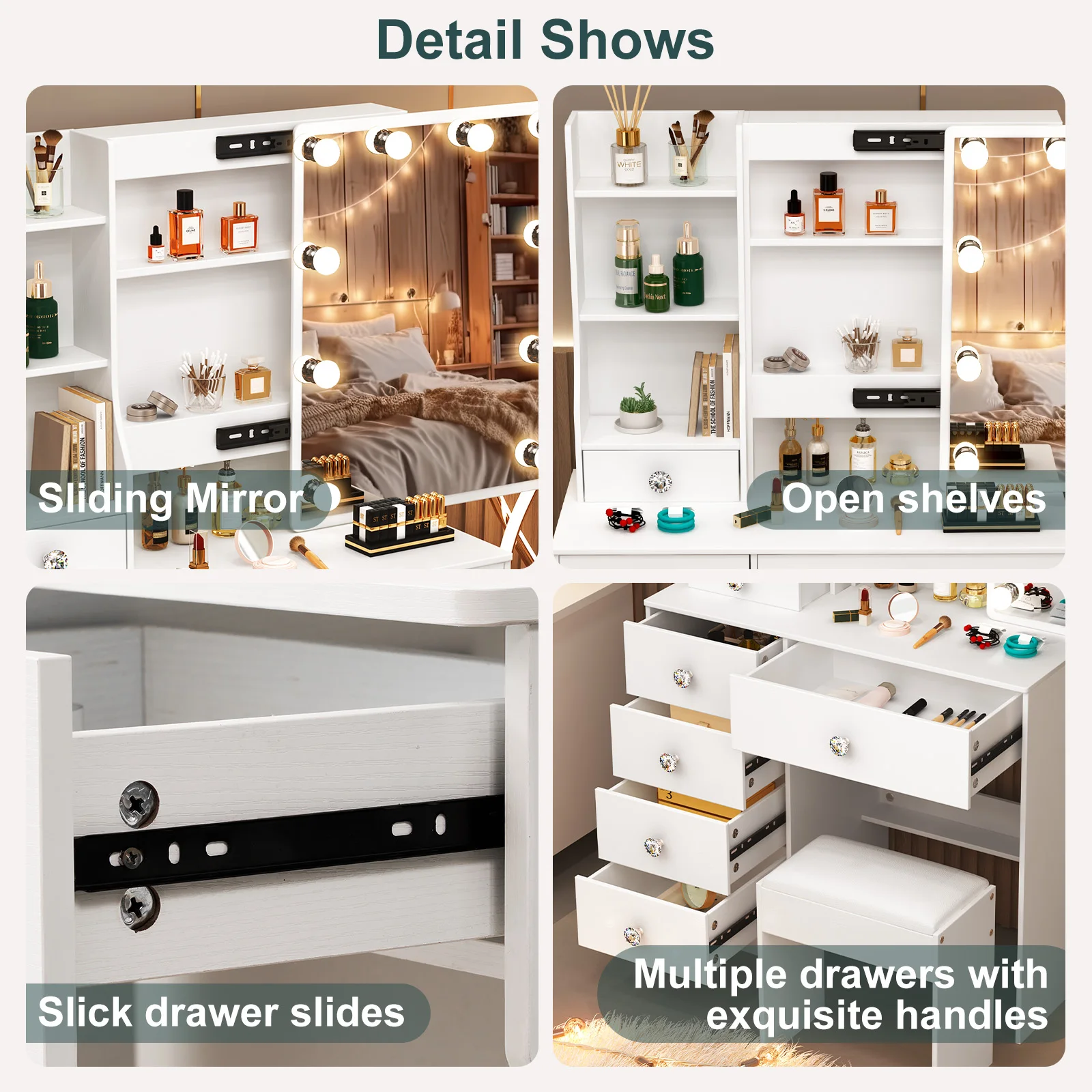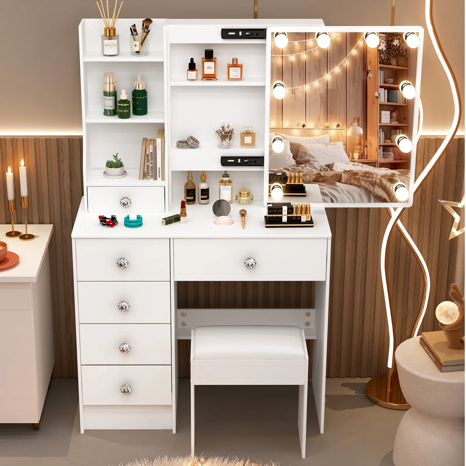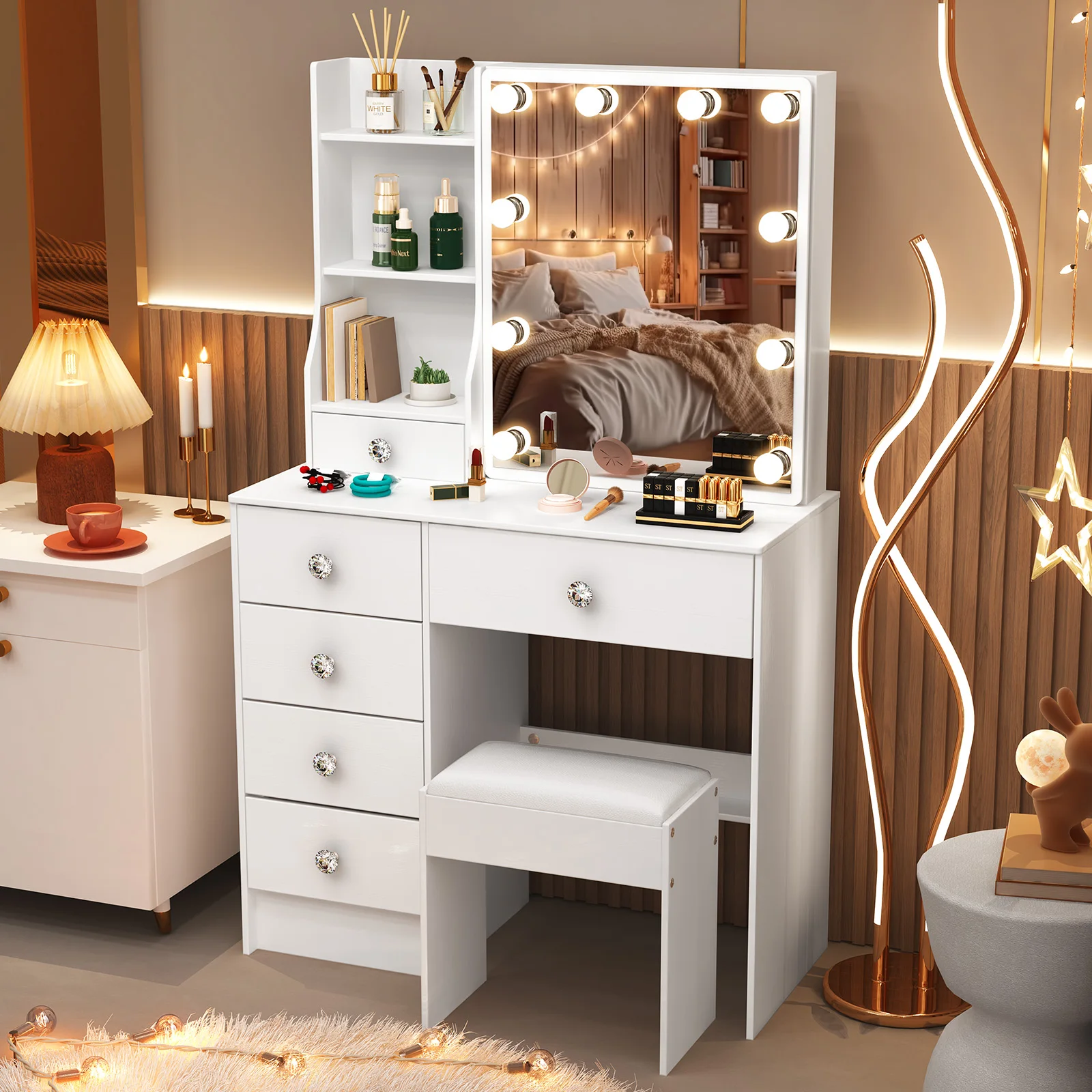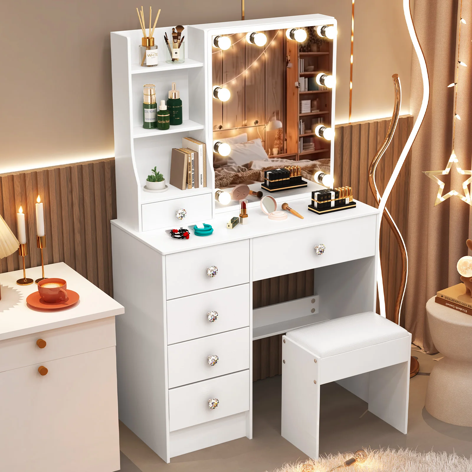 【11.11 Deals, Black Friday Deals 2025】Dressing Table Mirror Drawers Vanity Makeup Desk Stool Set With LED Lights White + Stool
