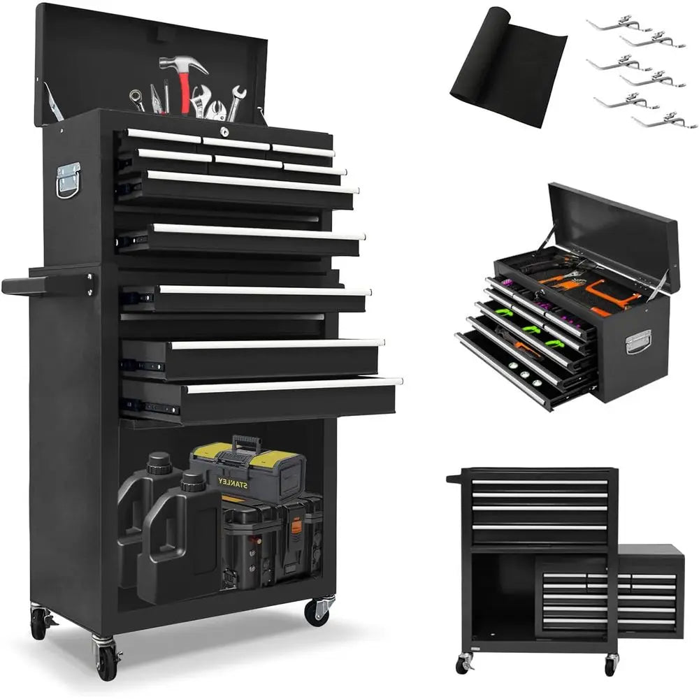 2-in-1 Rolling Tool Chest with Lockable Metal Cabinet, Detachable Drawers, and Wheels for Garage Workshop (Black)