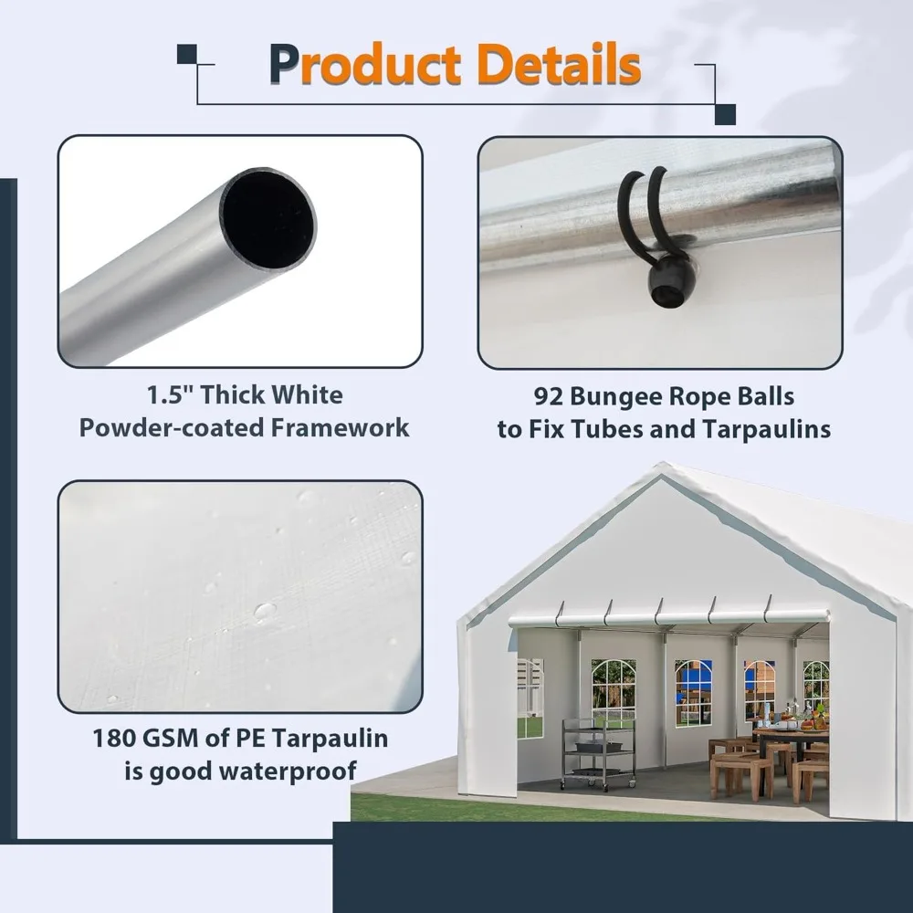 - MULTIPURPOSE: With ample space, our large party tent meets a variety of needs, Place it outside as an area for wedding receptions, graduation parties, or a big backyard barbeque. Use it outdoors for wedding receptions, graduation parties, or large backyard barbecues. This versatile canopy protects not only your car but also furniture, garden tools, and materials for outdoor projects from the elements.