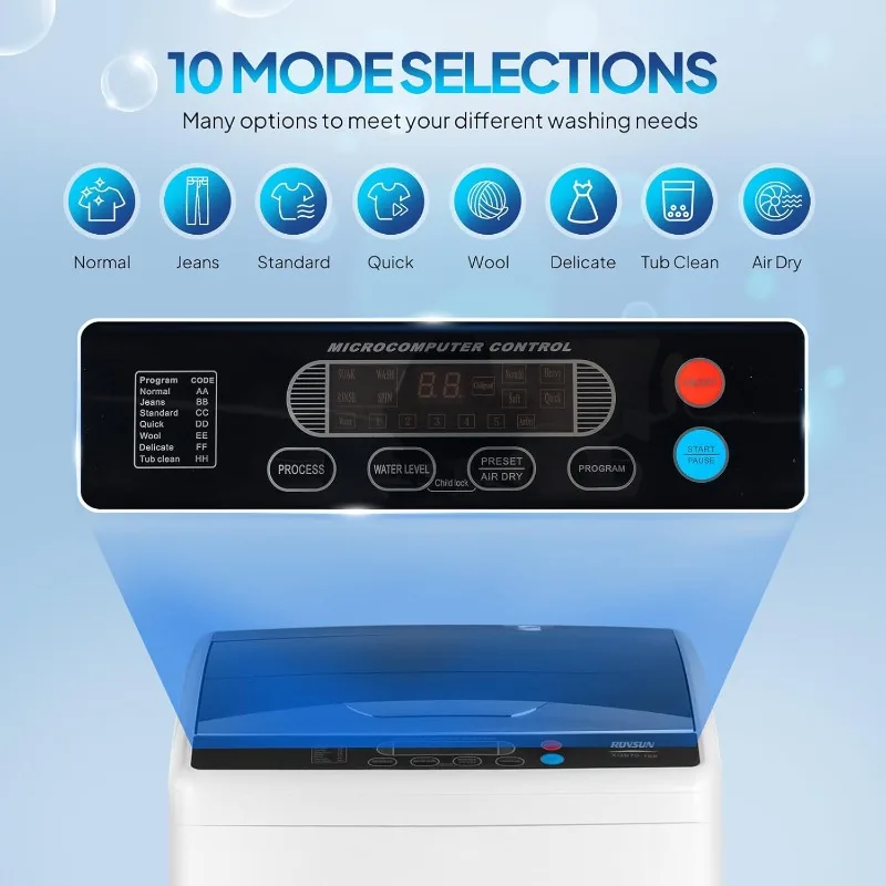 - 【User-Friendly Design】Designed for ease & safe of use, this compact washer includes a child lock for safety and adjustable feet for stability. The self-cleaning ensures that the washing machine's stainless steel inner tub is clean. And the clear control panel makes operation straightforward. Perfect for busy households, ensuring everyone can use it safely and effortlessly