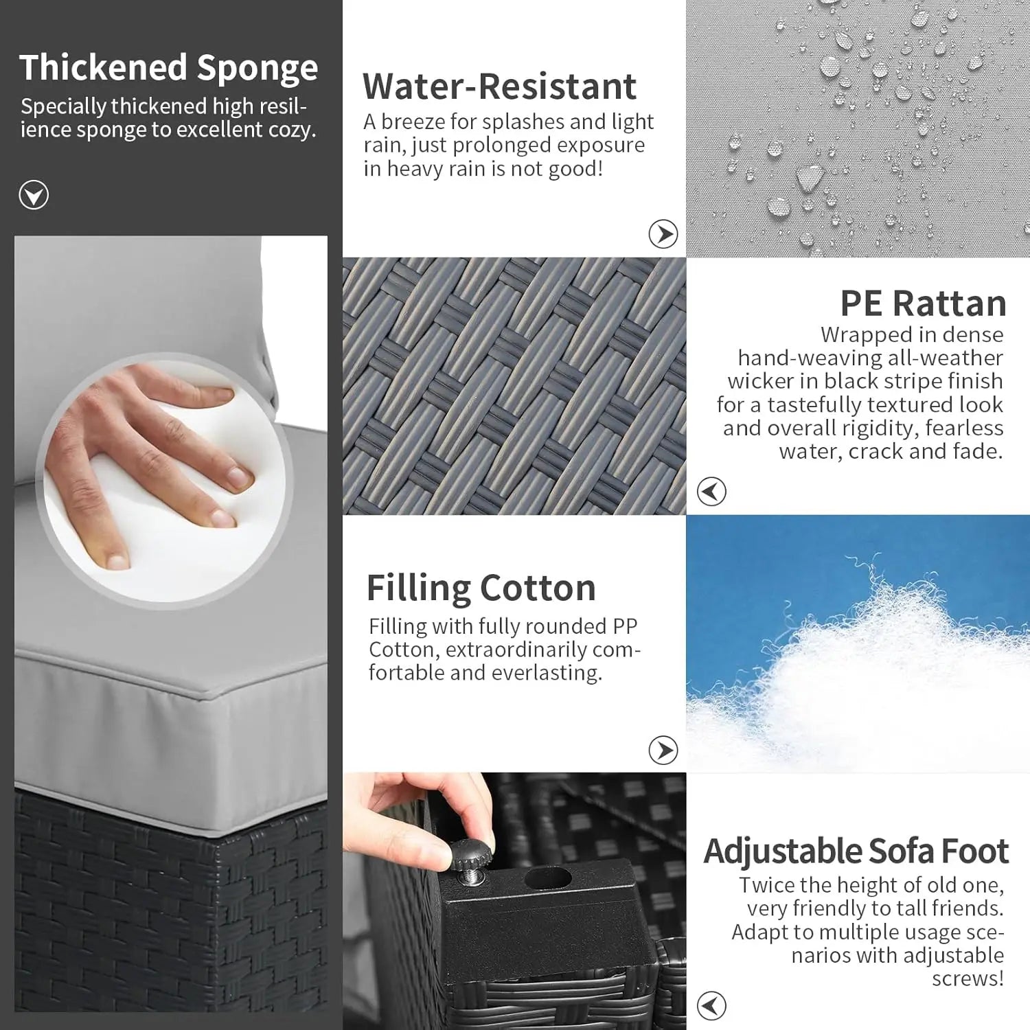 Highly Adaptable: bring versatile and exciting style and seating space with this outside furniture with differentiated design, distinctive outdoor couch, ottoman and configuration; graceful, casual style that doesn't compromise on comfort and durability, suitable for any decorative fashion and scene; the patio storage table with lining allows storing multiple items for easy access anytime, greatly enriching your outdoor life.