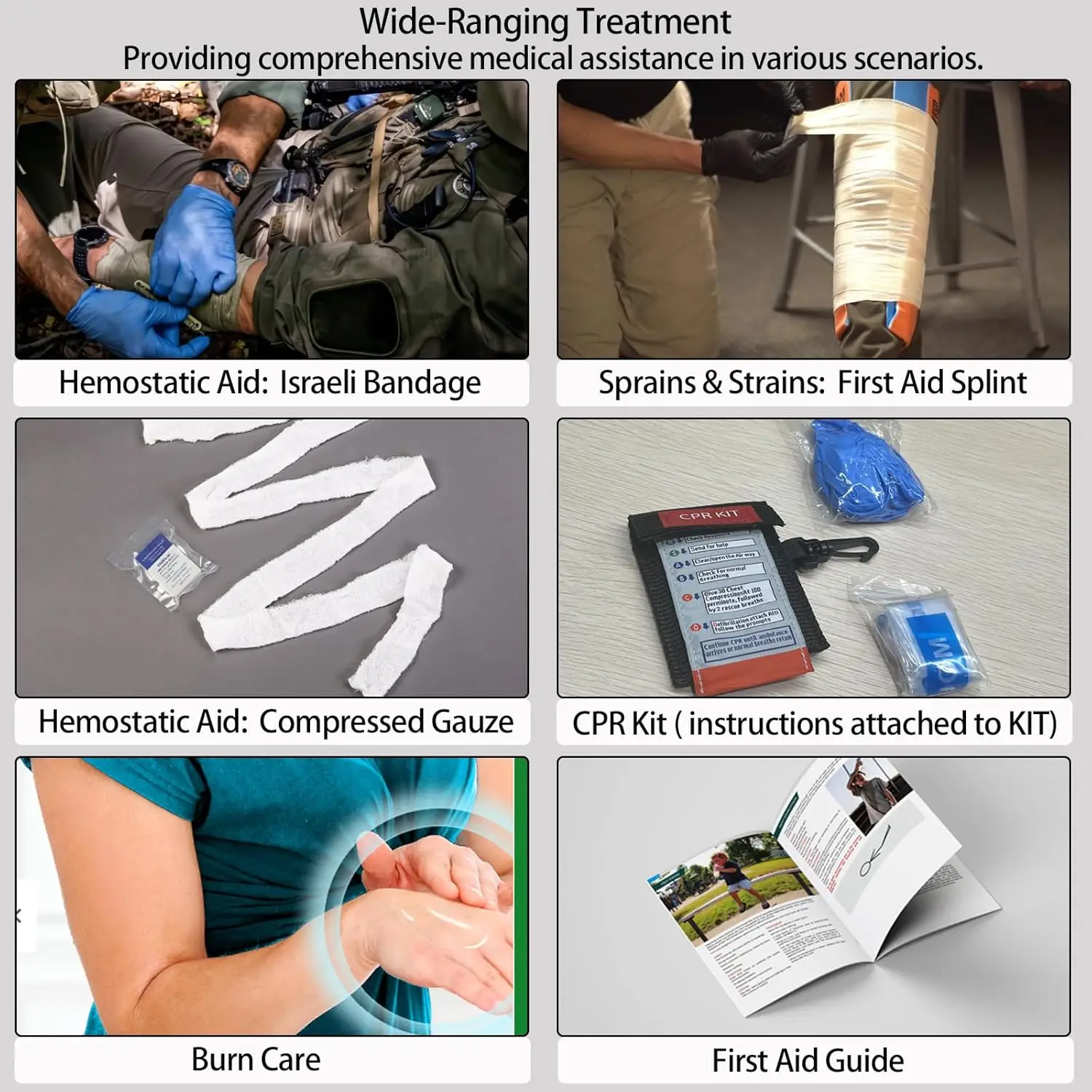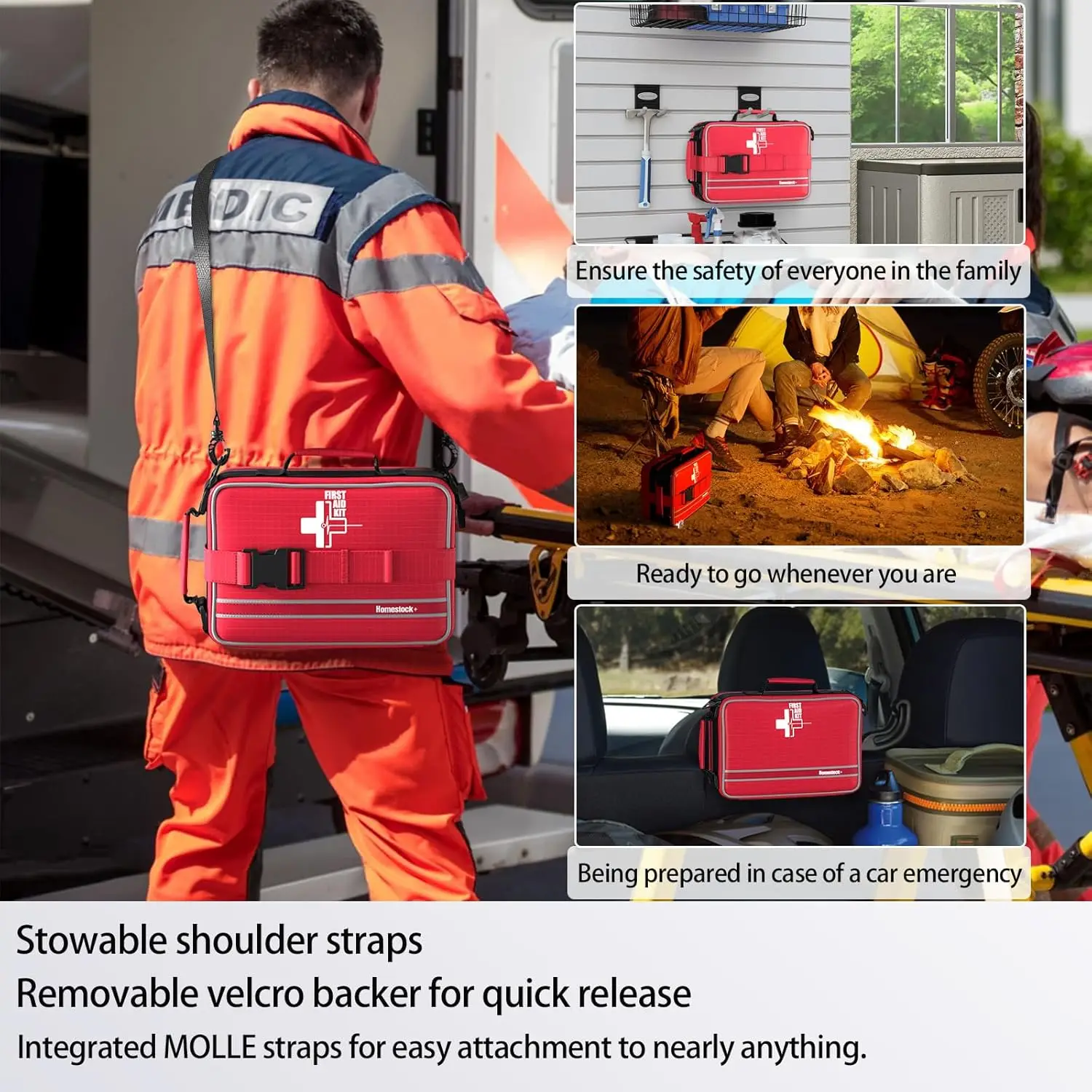 This premium first aid kit is designed to provide reliable emergency care in various settings, from daily use to outdoor adventures. It features a well-organized system with labelled compartments for quick access and identification of supplies. Key Features: - **Comprehensive Contents**: Includes 324 pieces of essential medical supplies such as bandages, antiseptic wipes, gauze pads, adhesive tape, scissors, tweezers, gloves, CPR masks, splints, and more. These items are suitable for treating minor cuts, scrapes, burns, and other injuries. - **Organized Design**: Color-coded and labelled compartments help you quickly find what you need during emergencies. Each section is clearly marked with typical uses for the items inside. - **Versatile Carrying Options**: Equipped with removable straps and secure buckles for easy transport. The kit has handles on top and sides for mounting on luggage or vehicles like cars and trucks. - **Durable Construction**: Made from high-quality rip-resistant polyester material that withstands harsh conditions during camping or hiking trips. Additional space allows customization by adding personal items. - **MOLLE Compatibility**: Features a removable MOLLE system that attaches to tactical backpacks or car seats using D-rings for flexible placement in any environment. Ideal Uses: Perfect for home safety preparedness; office emergency kits; car travel essentials; backpacking excursions; camping trips; cycling outings; disaster response situations like hurricanes or earthquakes where quick access to medical supplies can be crucial. Benefits: Ensures peace of mind by having a comprehensive set of tools ready when needed most—whether at home dealing with everyday accidents or outdoors facing unexpected challenges while exploring nature's beauty safely without worry about lack of proper equipment nearby.