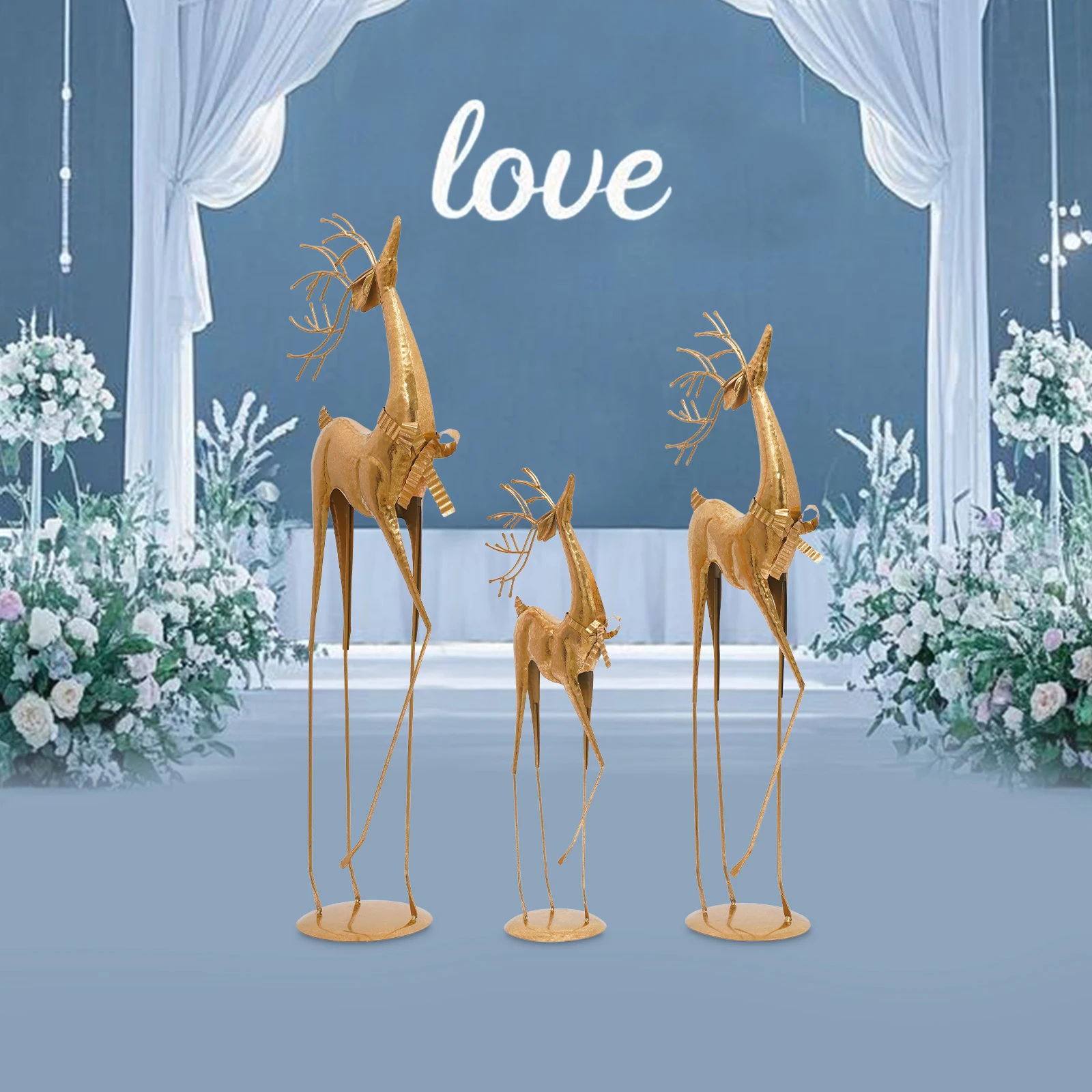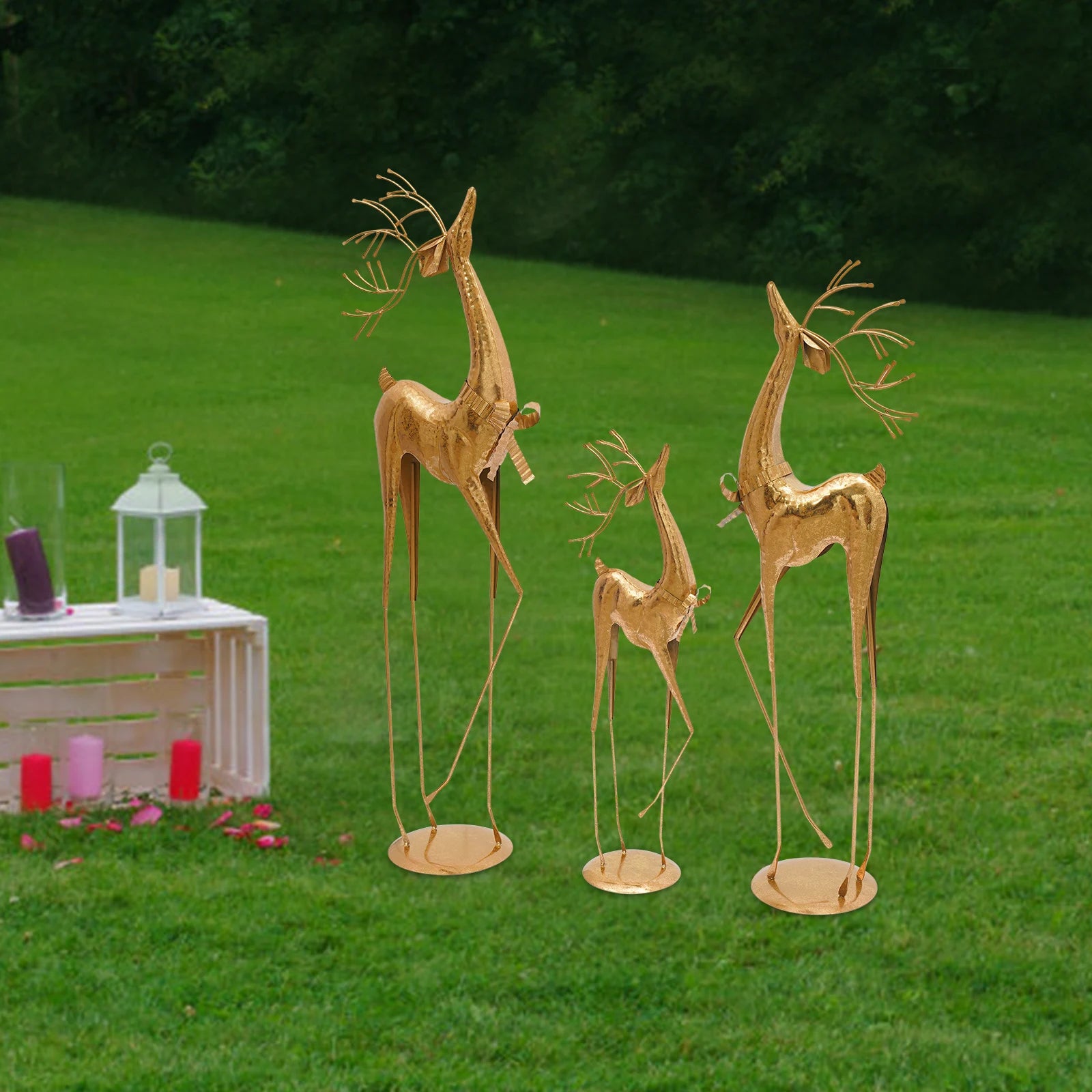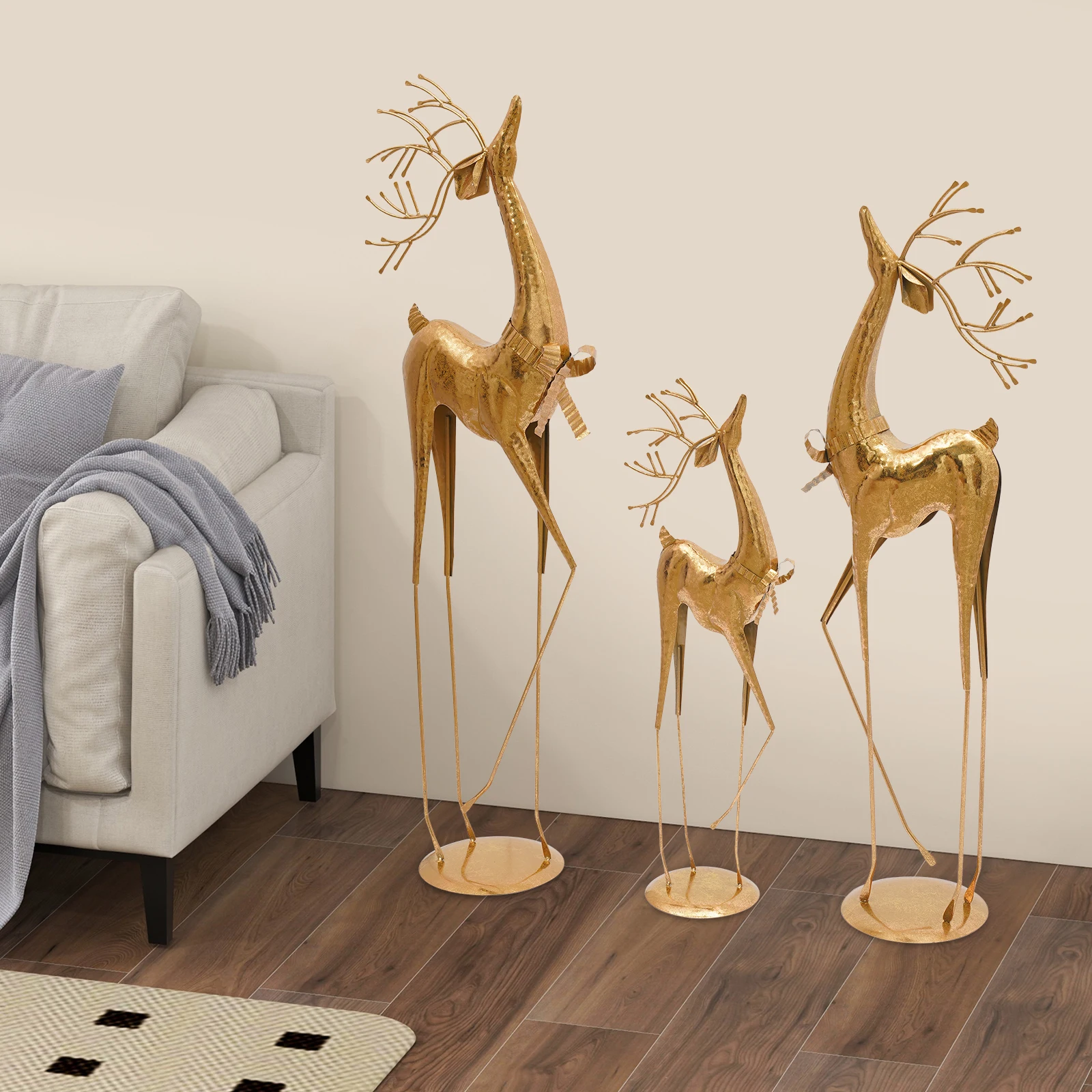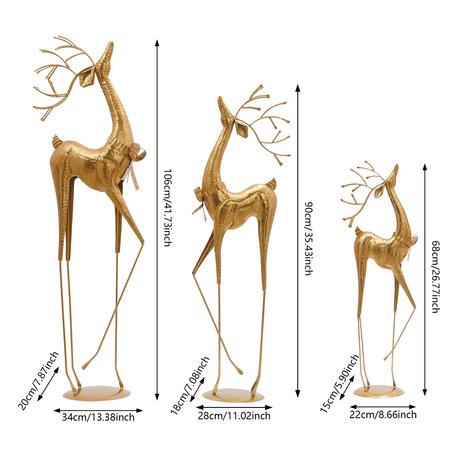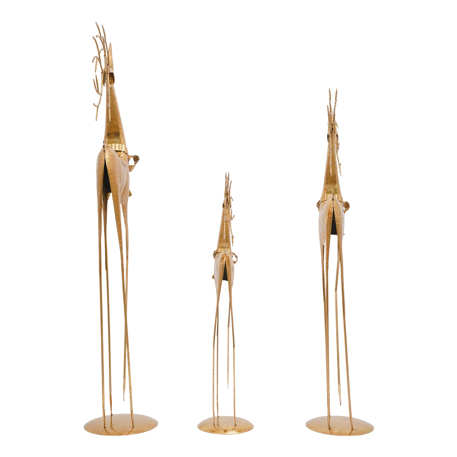 Distinctive Sculptural Trio: Crafted from lustrous metal with a noble golden sheen, this elegant trio of deer sculptures—each in varying sizes—stands proudly with heads held high, embodying the harmony and beauty of nature. As a versatile three-piece set, they can be artfully arranged in different configurations to create dynamic decorative effects.