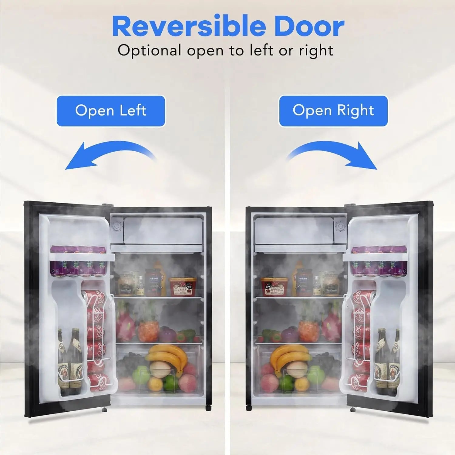 Compact Size with Ample Capacity: The fridge offers a generous capacity of 4.3 Cu. Ft, with dimensions of 20.63" W x 20.94" D x 32.72" H, occupying only 3 sq. ft of space. It comes with a freezer capacity of 0.42 Cu. Ft and a refrigerated section capacity of 3.88 Cu. Ft, providing ample room for storing a variety of food and beverages. This makes it an ideal choice for college dorm rooms, offices, garages, home bars, small apartments, and RV campers