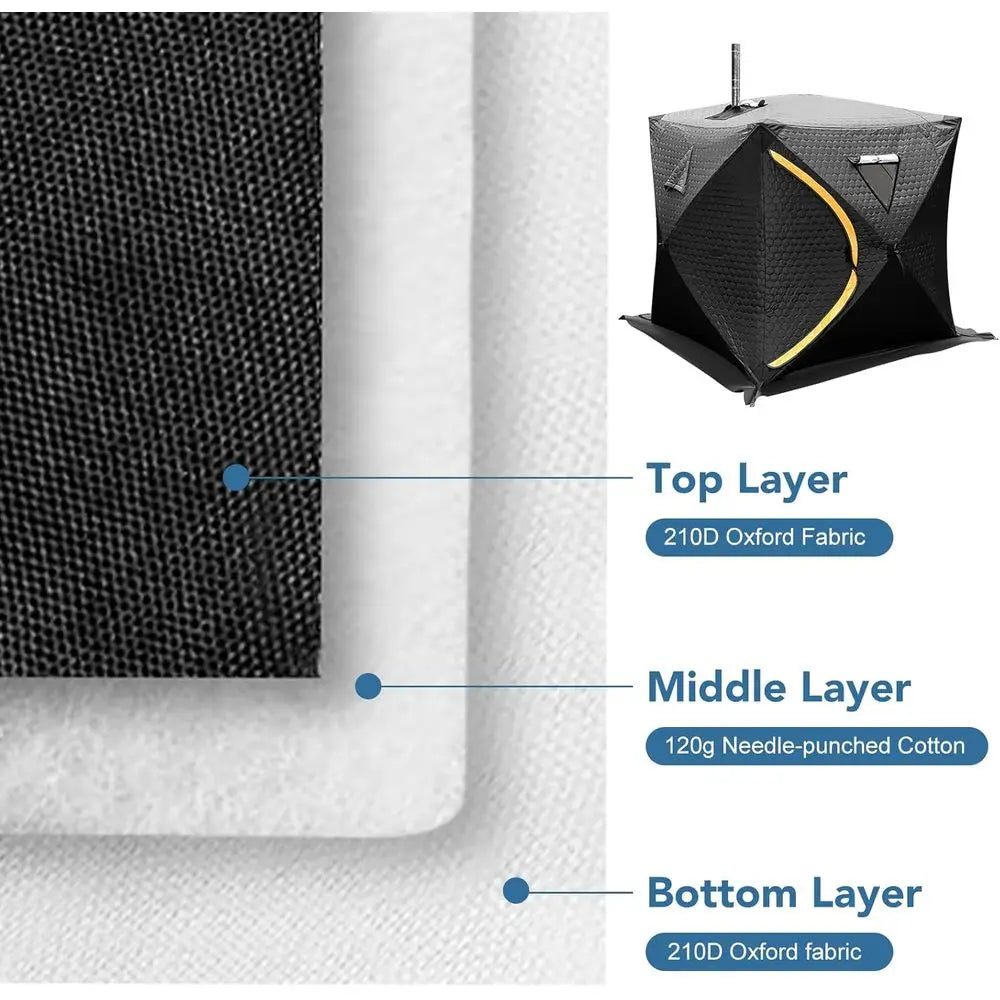 Constructed from 210D Oxford cloth, this tent is both durable and water-resistant, making it suitable for various weather conditions. Its insulation and thermal layers are designed to keep the cold out and maintain a comfortable temperature inside, while the flame-retardant treatment on the lining and mesh screen ensures safety against open flames.