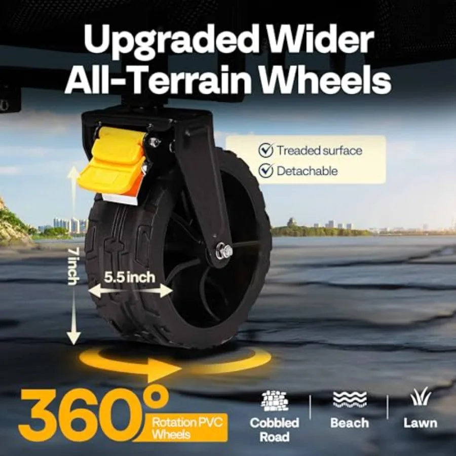 OVERSIZED WHEELS FOR ANY TERRAIN: Equipped with large 7" x 5.5" PVC wheels that deliver excellent grip across gravel, sand, grass, or pavement; Tires are detachable for easy replacement and cleaning; Treaded surface improves traction, while the built-in tire brake ensures safety and prevents movement on slopes or uneven surfaces