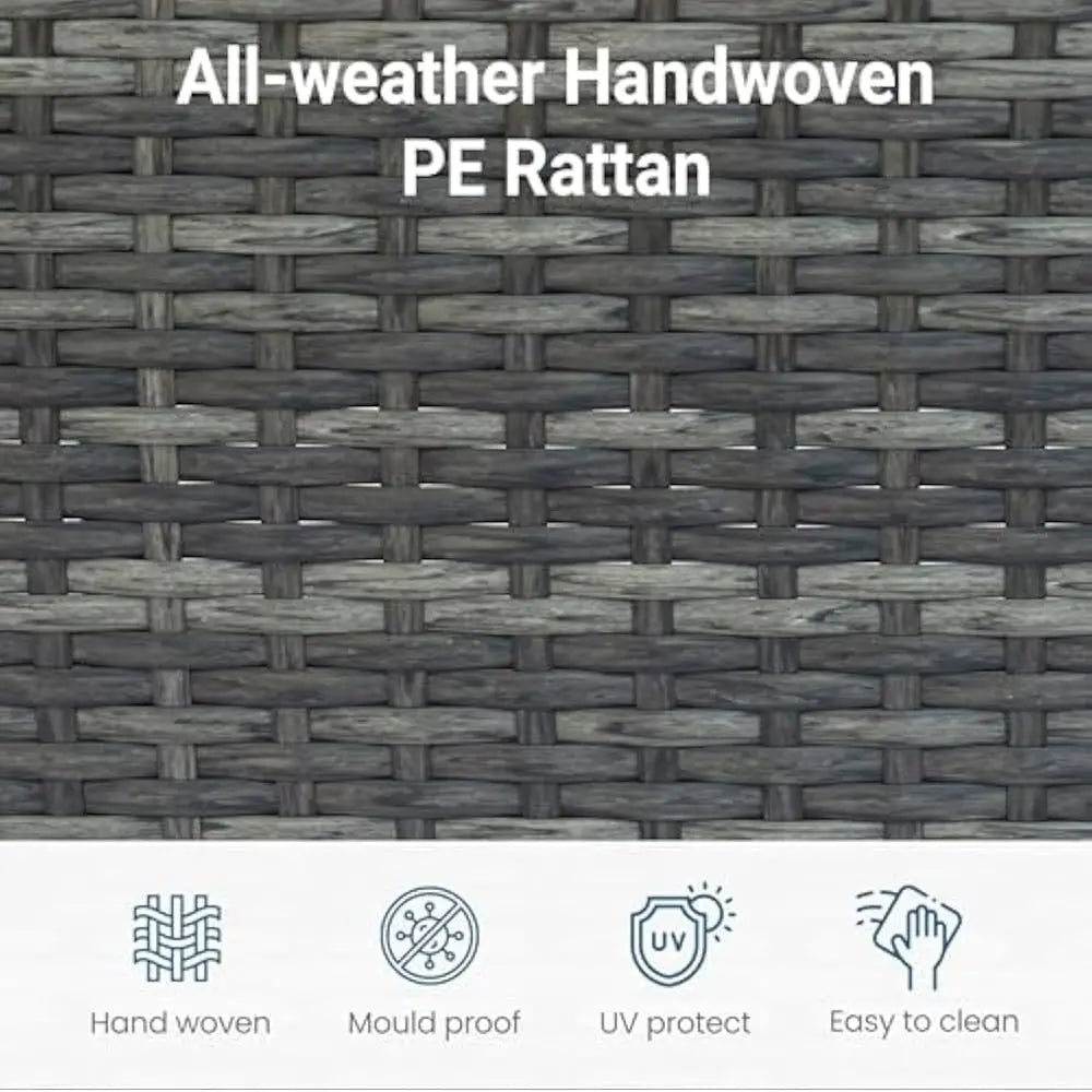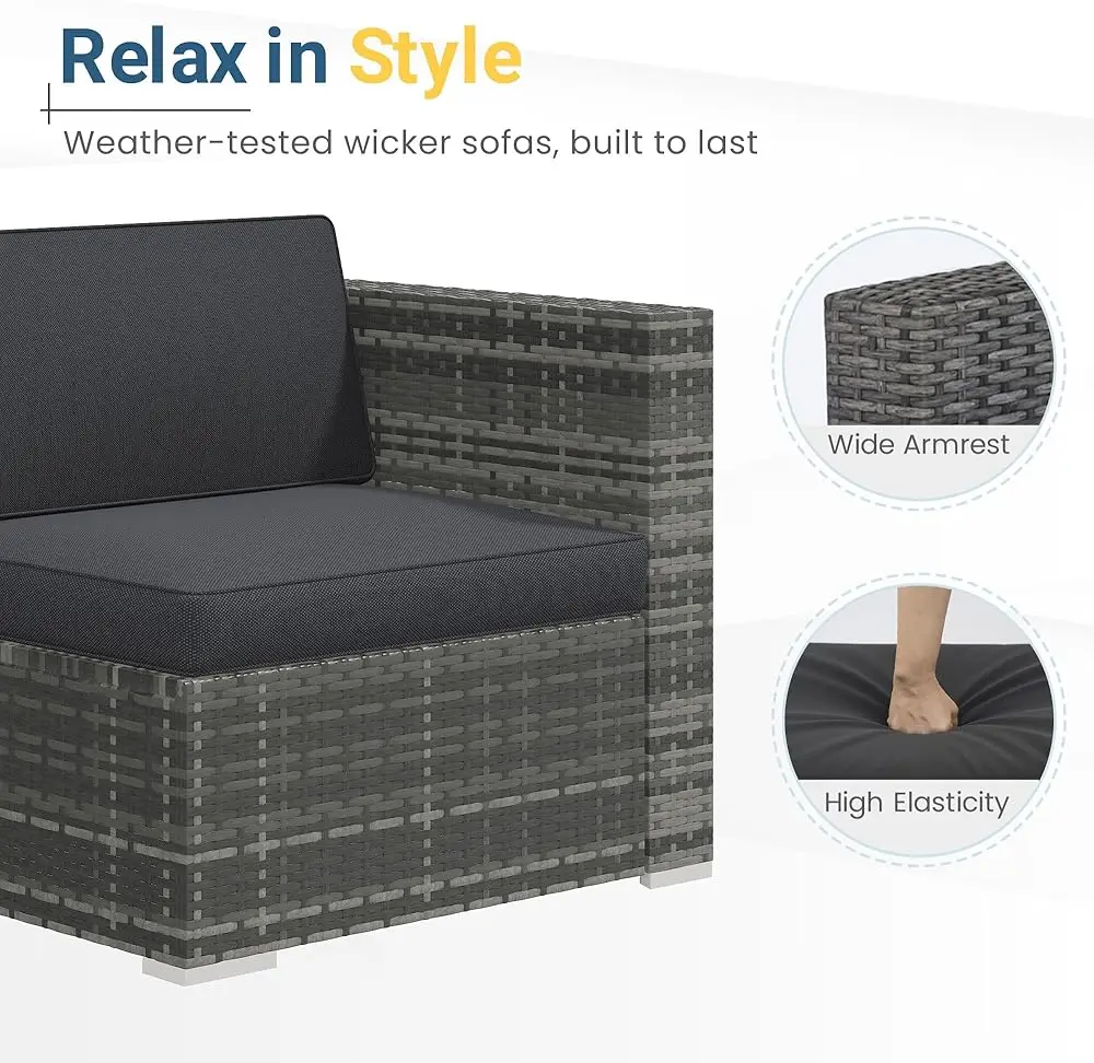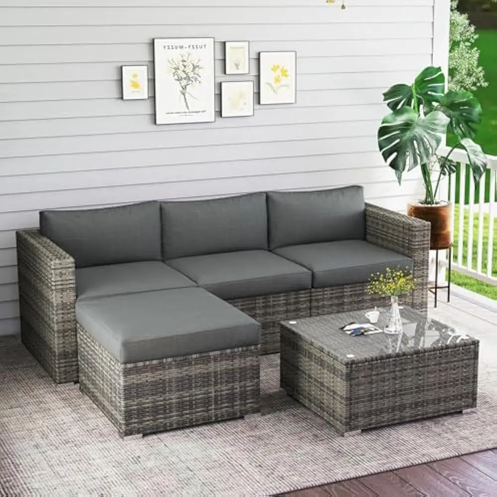 - Build To Last: The 5-piece patio furniture set includes 2 corner sofas, 1 armless sofa, 1 ottoman, and 1 coffee table with a tempered glass top. It features an iron frame for added stability, while the handwoven rattan surface is smooth and waterproof, ensuring durability for long-lasting outdoor use.