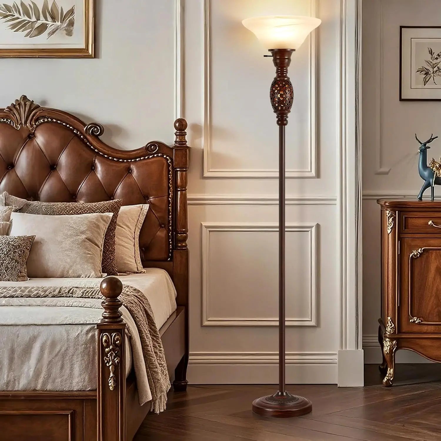 Subtle & Soothing Glow: Designed as a tall floor lamp for living room, its frosted glass shade and resin carvings diffuse flicker-free, warm light—perfect for relaxation or as a corner floor lamp accent