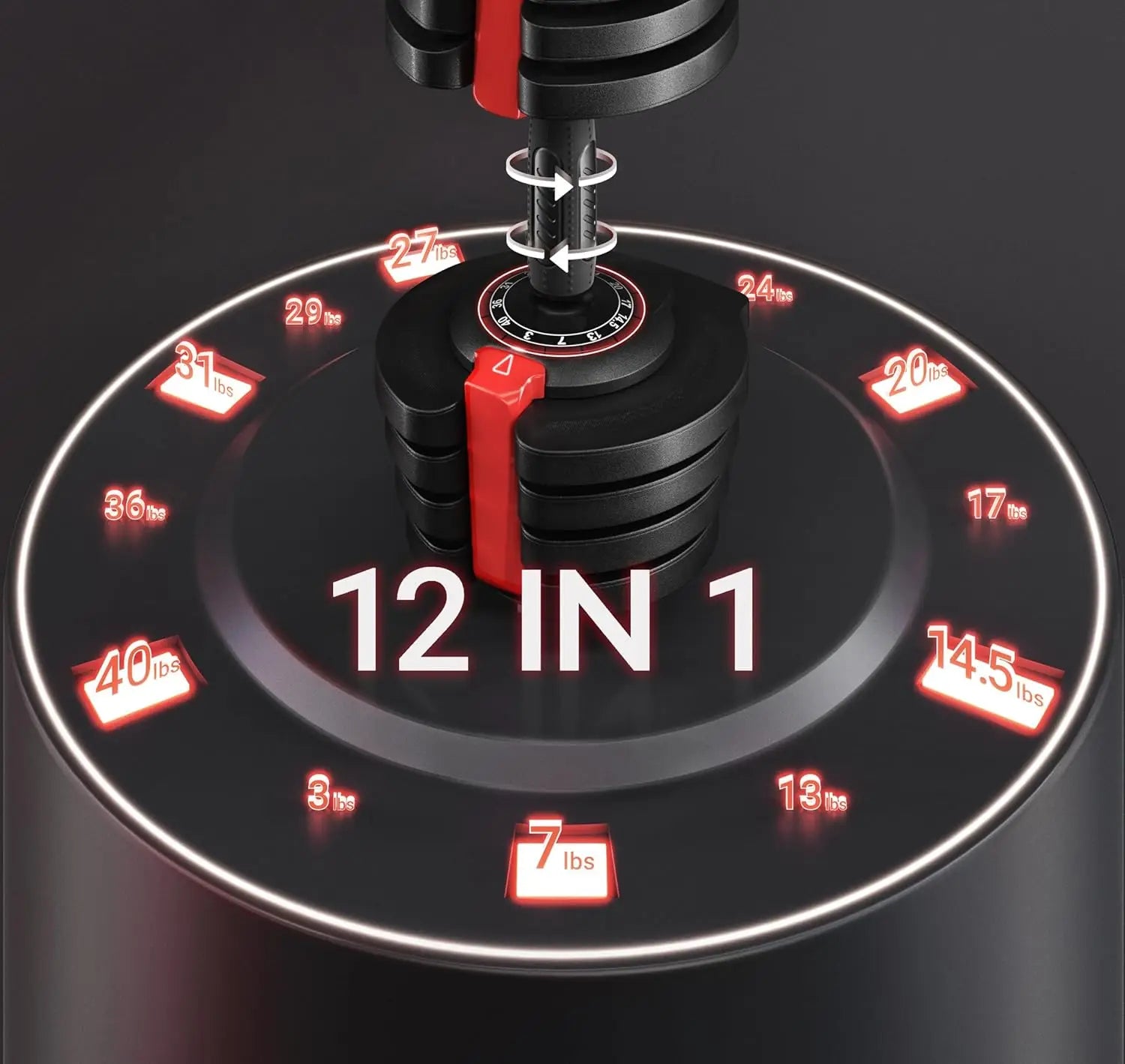 Transform your home gym with this versatile adjustable dumbbell set, designed to enhance your strength training routine. Key features include: 1. **Wide Weight Range**: This set offers a broad weight spectrum from 4 lb to 40 lb, allowing for precise adjustments in resistance, intensity, or volume to suit various fitness levels and workout goals. 2. **Quick Adjustment System**: Experience seamless transitions between weights with the easy-to-use selectorized anti-slip handle. Simply grip, twist, and lift to switch among the 12 adjustable settings in just one second, supported by clear dials for effortless readability. 3. **Durable Construction**: Built with solid steel plates and protected by polypropylene covers, this equipment ensures long-lasting durability while providing extra resistance against water and wear during intense workouts. 4. **Total Body Workout Capability**: Achieve comprehensive fitness results by performing a variety of exercises. The wider weight range enables heavy movements like shrugs and lunges as well as lighter activities such as curls and raises for balanced muscle development. 5. **Space-Efficient Design**: With compact dimensions of 16 inches in length, 8 inches in width, and 8 inches in height, this dumbbell set minimizes storage space. Easily store it under a workout bench or on a garage shelf after use for convenient organization. Ideal for both men and women seeking effective home gym solutions.