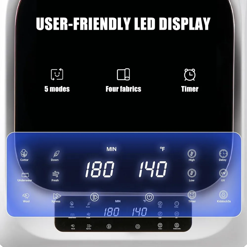- [6 Drying Modes] The dryer is equipped with an LED smart touchscreen, featuring 6 modes tailored to different fabrics: strong drying for cotton & linen, fluffy care for down, gentle drying for underwear, low-temperature shrinkage prevention for wool, refresh & deodorize, and quick drying for emergencies—meeting diverse needs. The inner tub's forward-reverse rotation design effectively prevents clothes from tangling and wrinkling. The tempered glass door allows easy monitoring of the process, and the magnetic door lock ensures safe use.