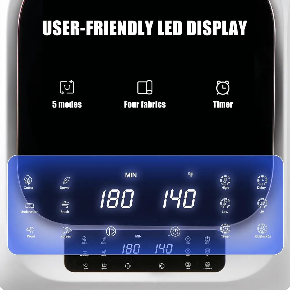 - [ 10 Washing Programs ] Easily controlled via the LED display, portable washer boasts 10 washing modes to cover all your needs: The 26-minute Quick Wash efficiently handles urgent laundry, while Normal/Heavy modes tackle different stains. The exclusive Baby Care program gently cleans infant clothes, and additional Tub Air Dryer and Tub Clean functions keep the inner tub fresh and hygienic. With 4 water levels for precise adjustment, plus a stainless steel inner tub that reduces fabric abrasion, this portable washer leaves clothes clean, soft, and well-cared for.
