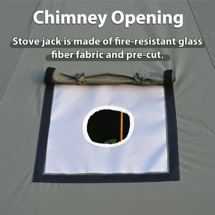 【More Designs】①You can easily adjust the tension of the guy line by pulling the tension regulator; ②A pre-cut chimney opening allows you to use the stove in the tent, which can provide extra warmth even on snowy days; ③The tent goes with a plastic waterproof cap on the top of the door pole, effectively prevents rain from leaking through the metal hole