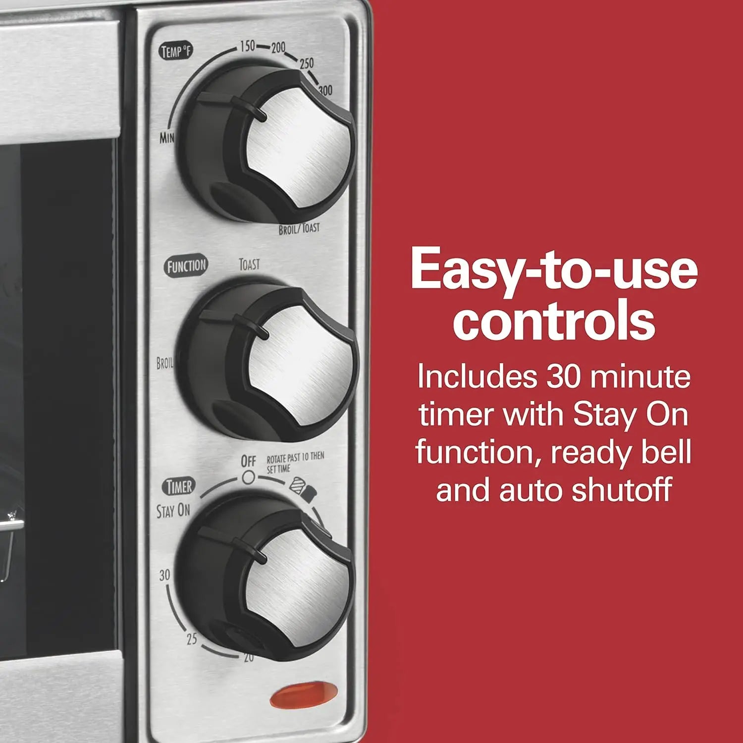 EASY-TO-USE CONTROLS: This toaster oven has simple controls that are easy to use. Perfect for anyone who wants a toaster oven that gets the job done without being complicated. Includes 30 minute timer with Stay On function, ready bell and auto shutoff.
