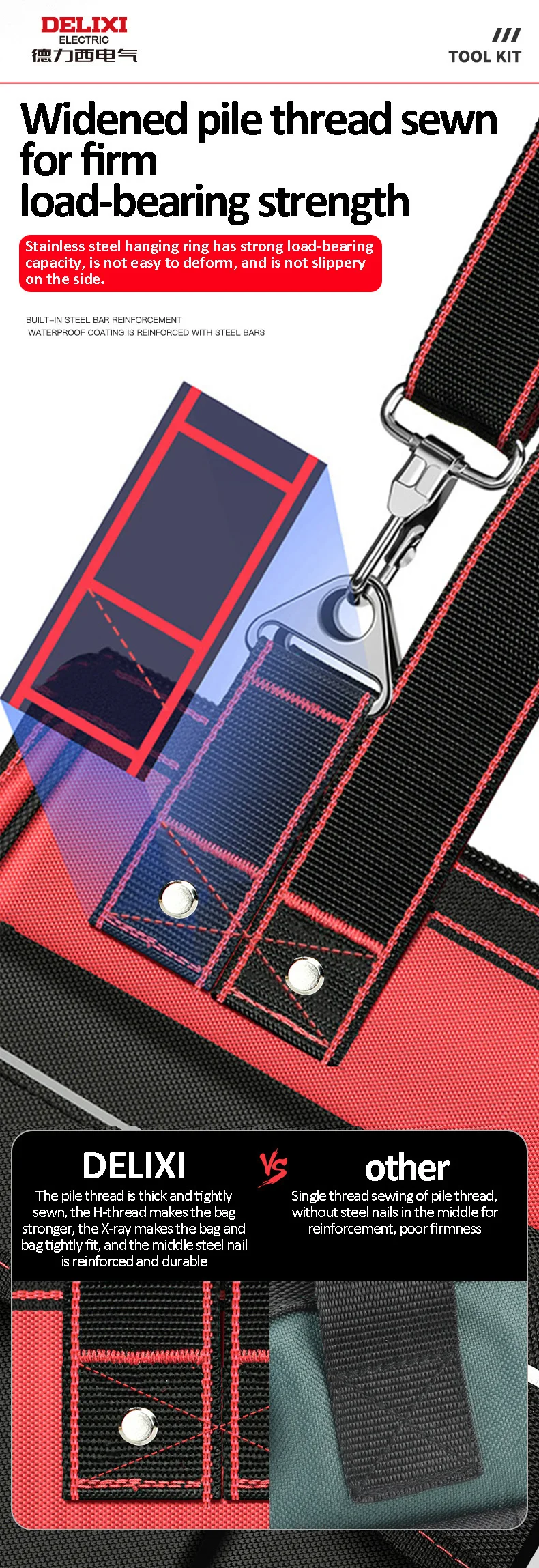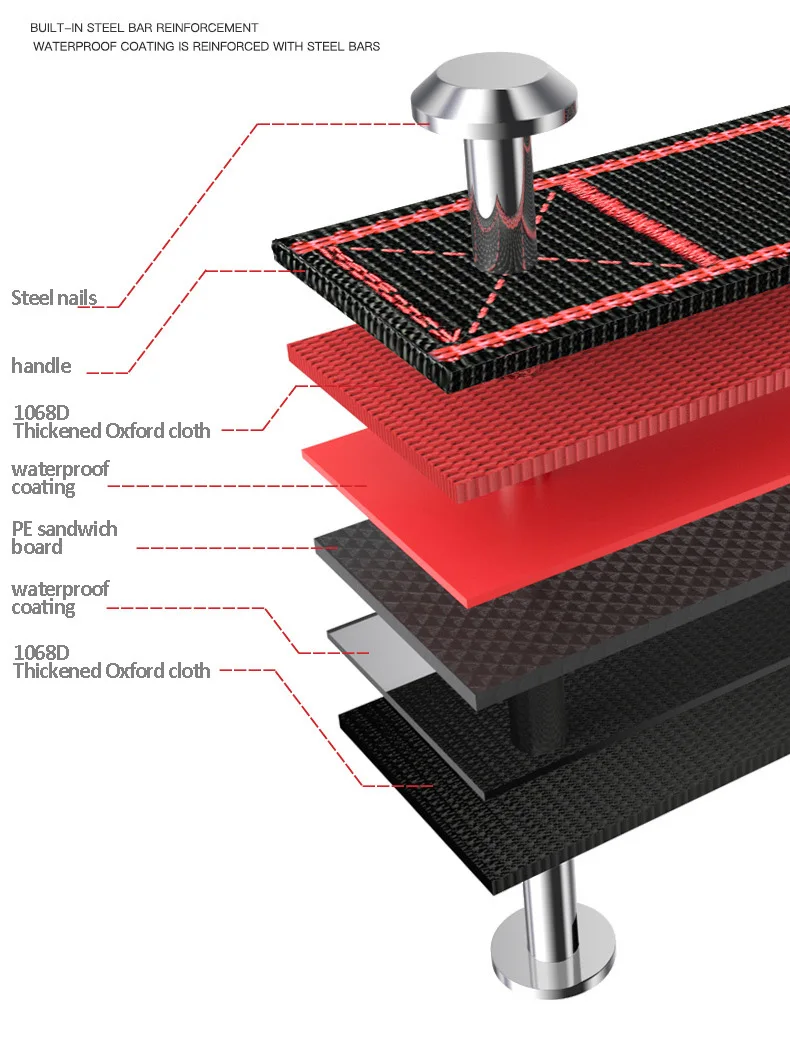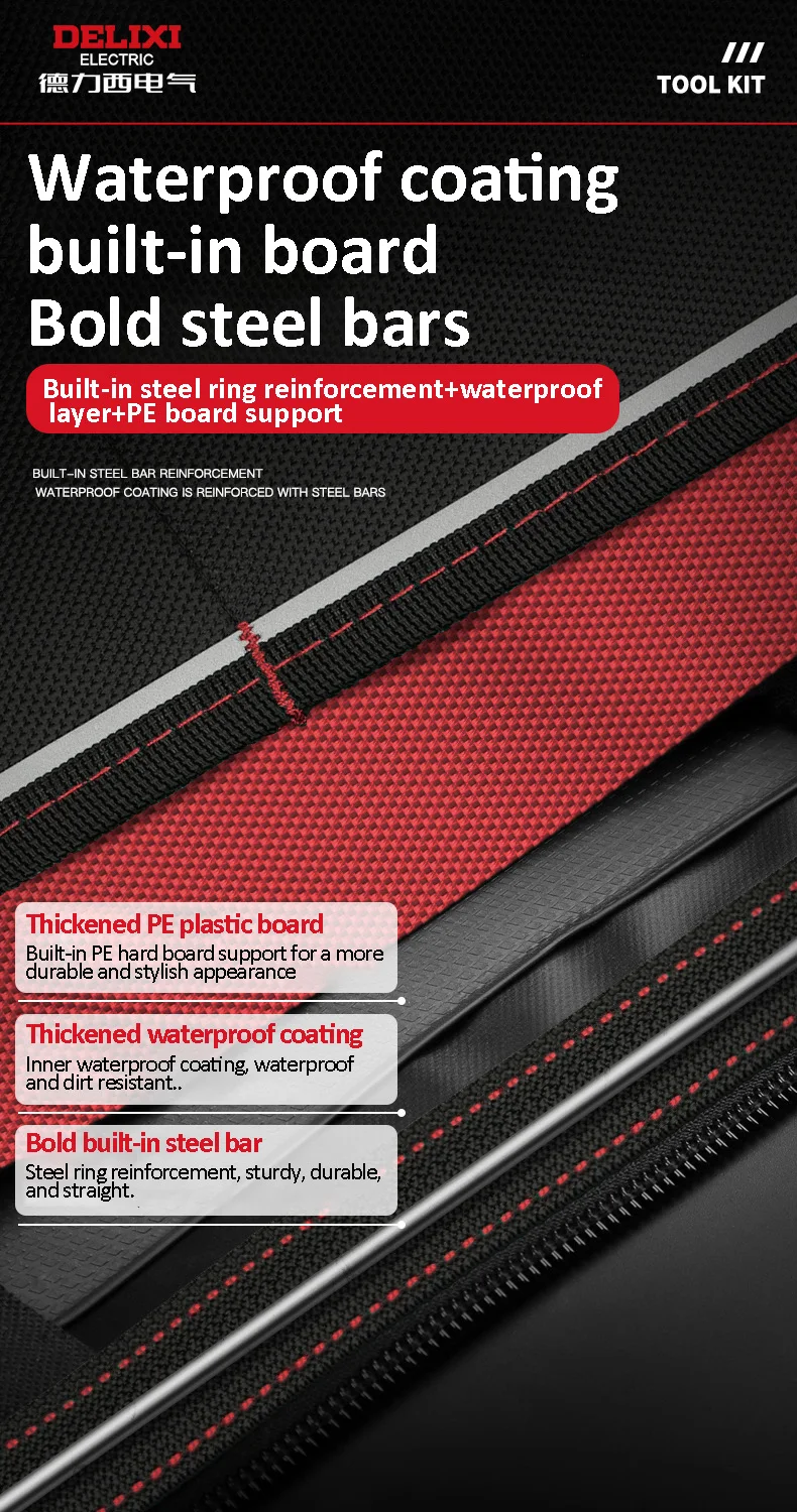 This tool kit is made of two layers of 1680D Oxford cloth+two layers of waterproof coating+thickened PE board, with