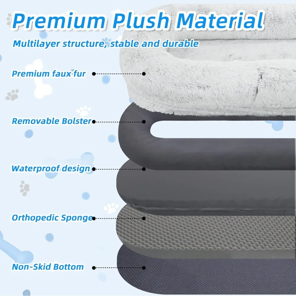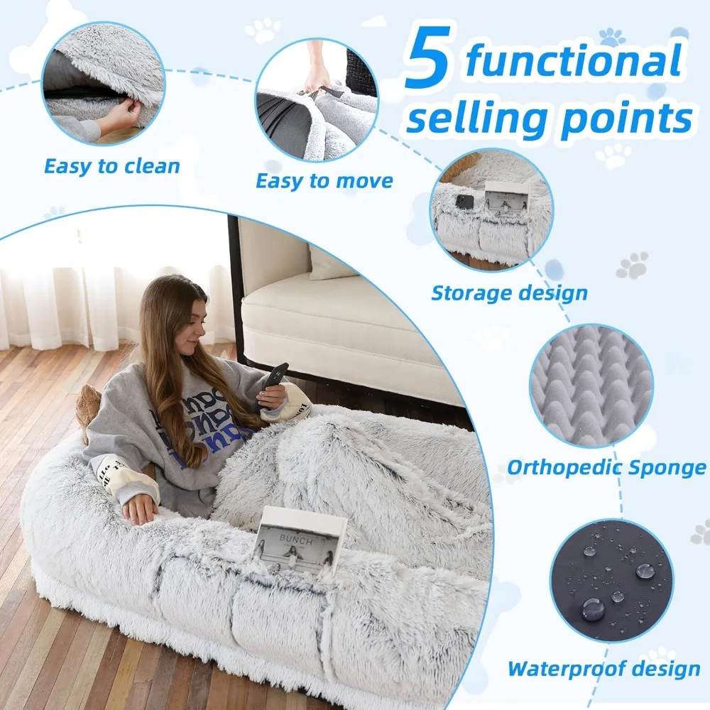 - Comfortable & Convenient: Human dog bed uses premium faux fur plush as the bed cover fabric, which is soft, warm, breathable, and durable; in addition, we have added a storage pocket on the side so that you can put some small items when you lie down inside; we have also presented a strap, so that you can easy storage the extra large dog bed