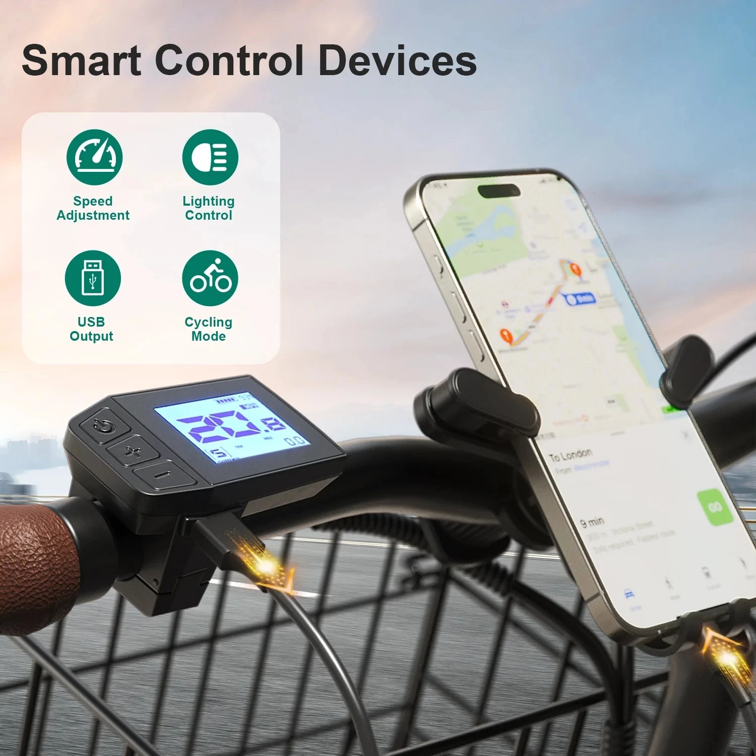 5 Riding Modes & USB Output - Meteor e-bike is equipped with 5 riding modes for you to choose from: ①Electric mode ②Pedal assist mode ③Cruise mode ④Manual mode ⑤Walking mode, which can be adjusted according to your riding habits. It is also equipped with a USB-A output port for emergency charging of mobile devices.