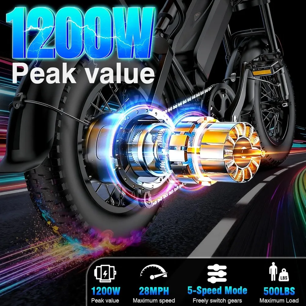 - 【1200W Peak Motor for Powerful Performance】 Equipped with a 1200W peak motor, this electric bike provides impressive power and speed, reaching up to 28MPH. Ideal for both city commuting and all-terrain adventures, it offers smooth acceleration and easy hill climbing, making every ride enjoyable and effortless.
