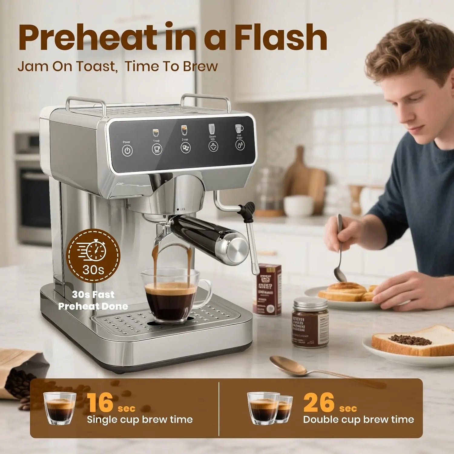 2. 20 BAR PRESSURE FOR AUTHENTIC ESPRESSO. espresso coffee machine features a commercial pressure pump that fully extracts the oils and rich flavors from coffee beans, letting you enjoy authentic café-style espresso in the comfort home. Perfect for coffee lovers who crave professional brews without leaving their space