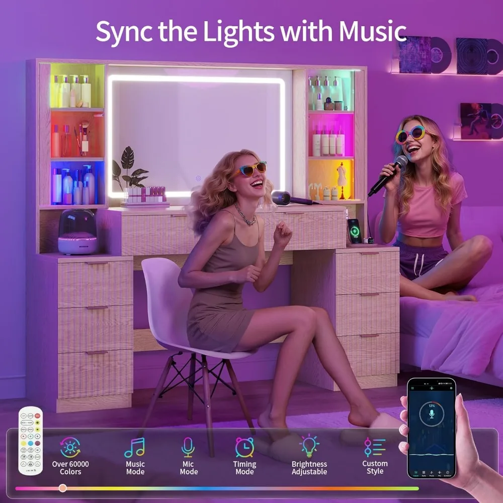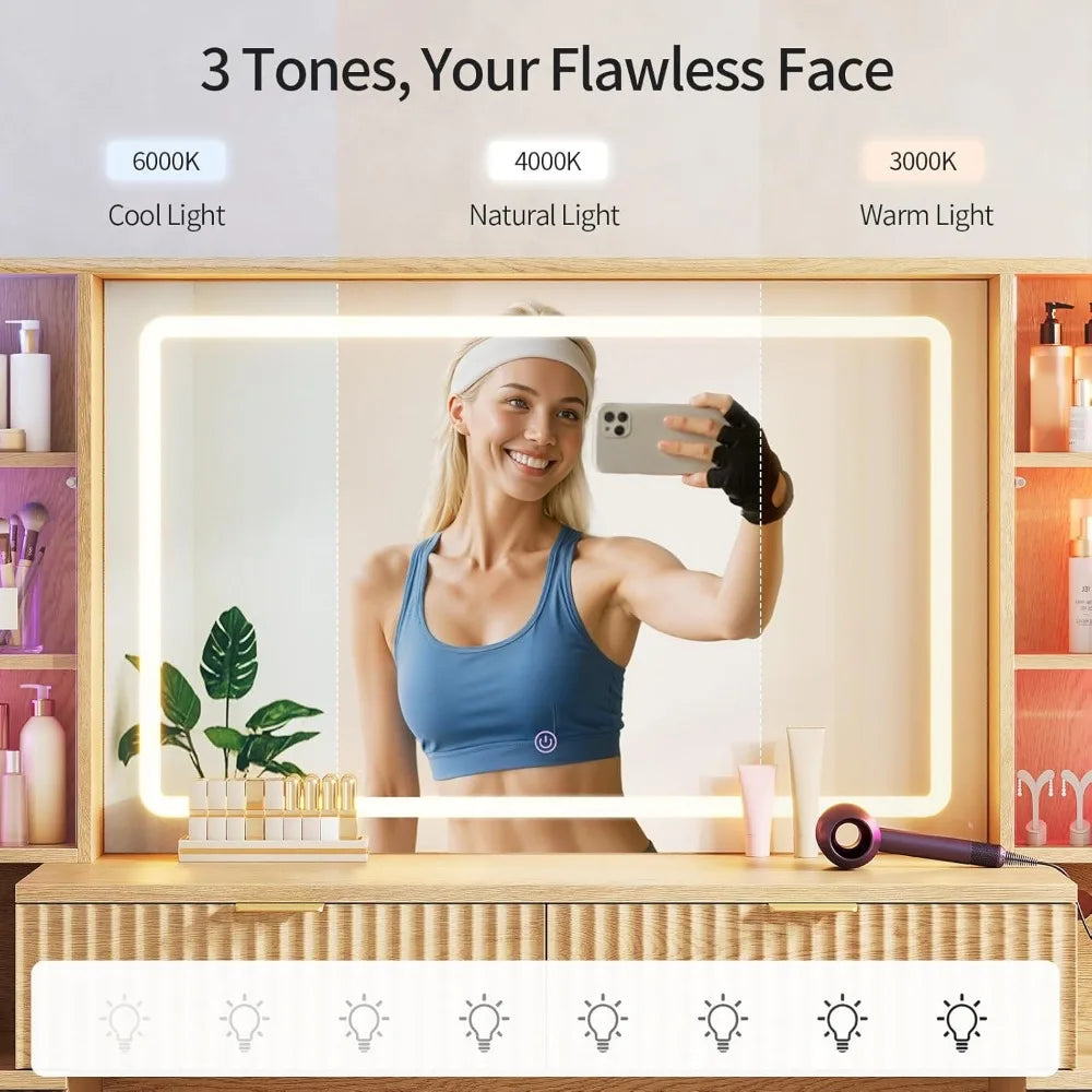 - Dynamic Lighting System: Achieve pro makeup day or night! The big vanity HD mirror features 3 color temps + adjustable brightness for flawless application. 60,000-color and sound-sync LEDs pulse to your music, transforming vanity time into a multisensory experience