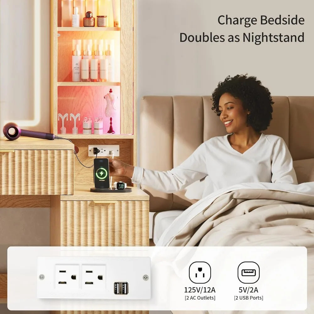 Fluted Wood Makeup Vanity Desk with Mirror and Sound Sync LED Lights, Large Vanity Dressing Table, Drawers, Glass Cabinets