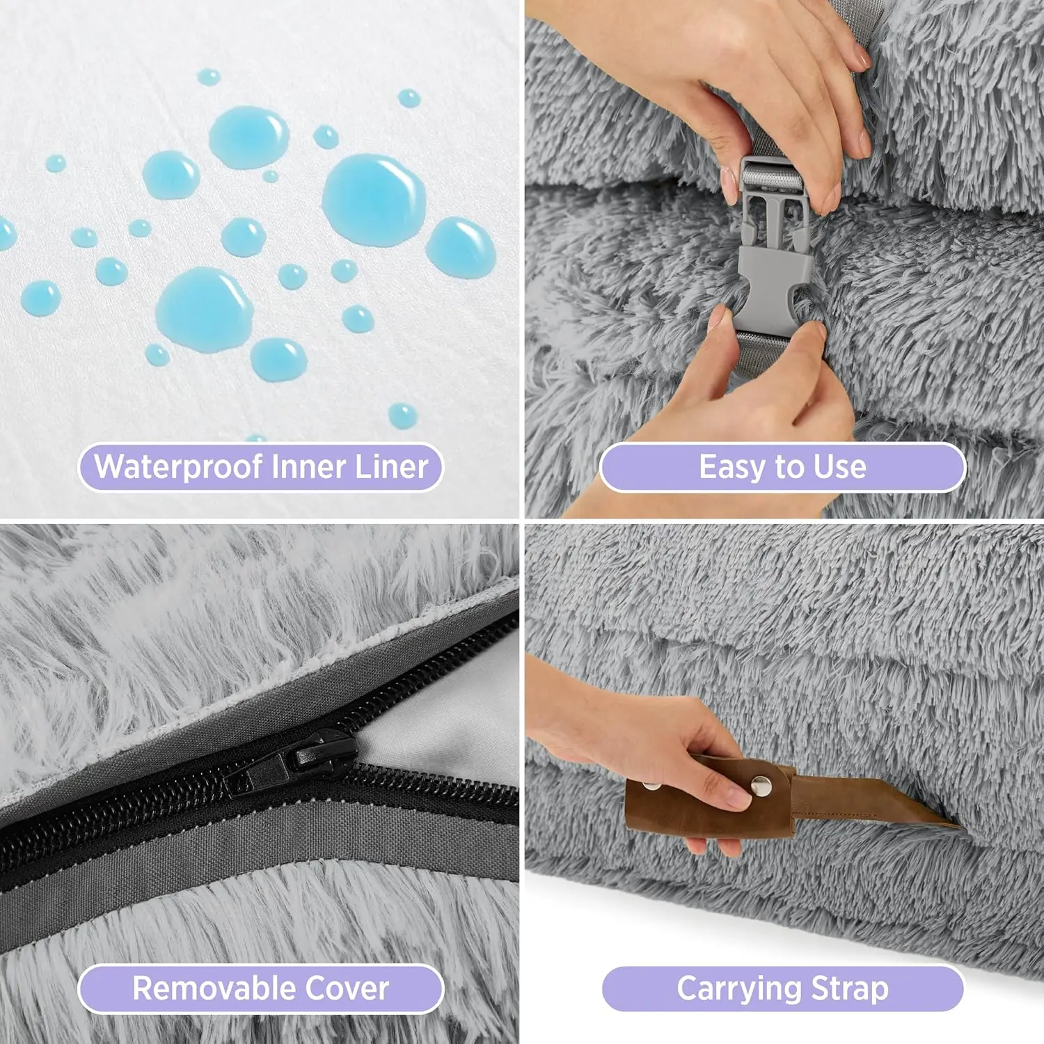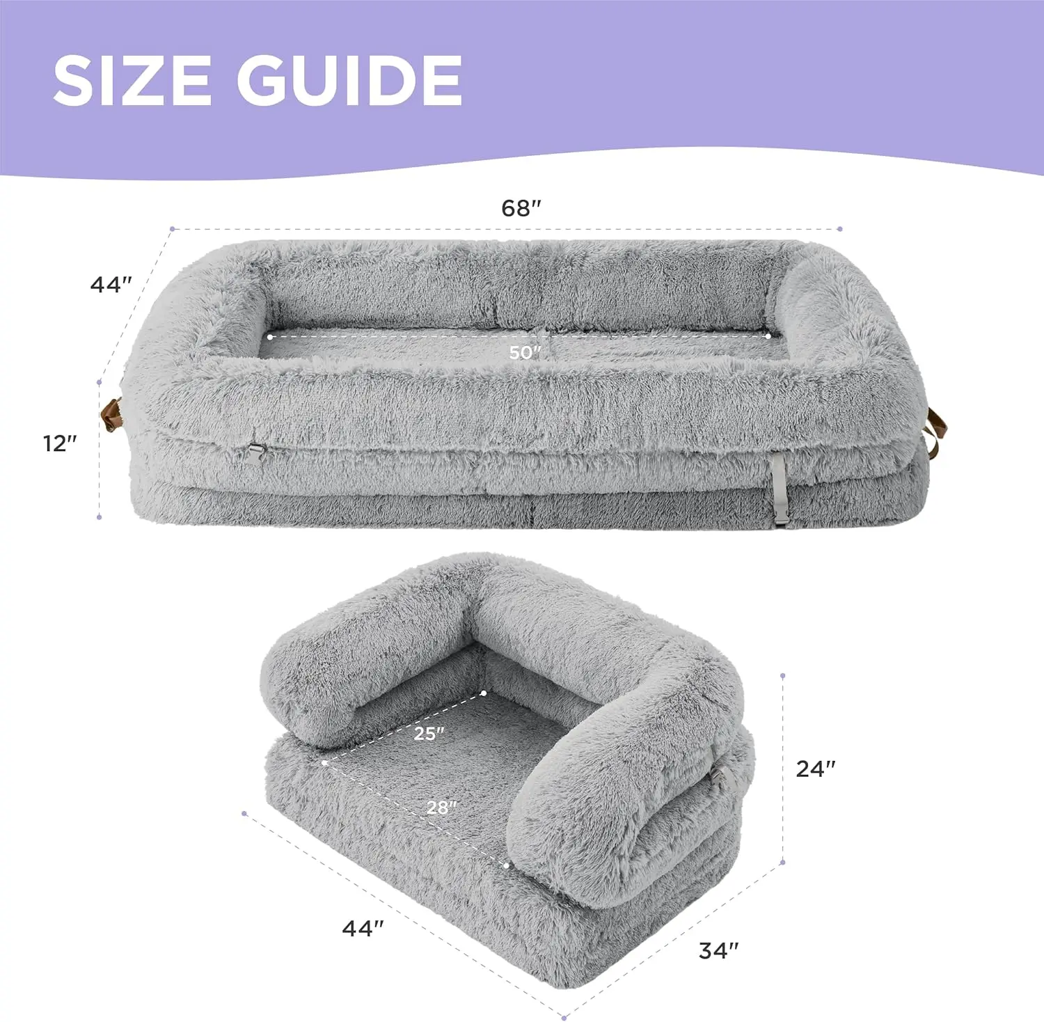 Foldable 3-in-1 Human Dog Bed with Orthopedic Foam, Waterproof Cover, and Soft Faux Fur - Grey