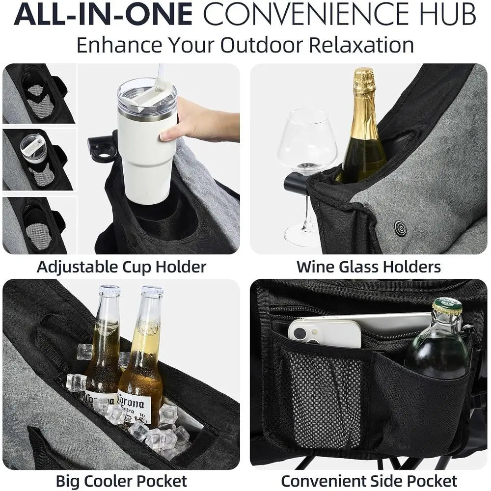 Extra Storage Space - The camping chair provides wide cup holders and dedicated wine glass holders; side pockets store phones,or carry bag. Our heated lawn chair delivers organized storage for tailgating and hunting gear.