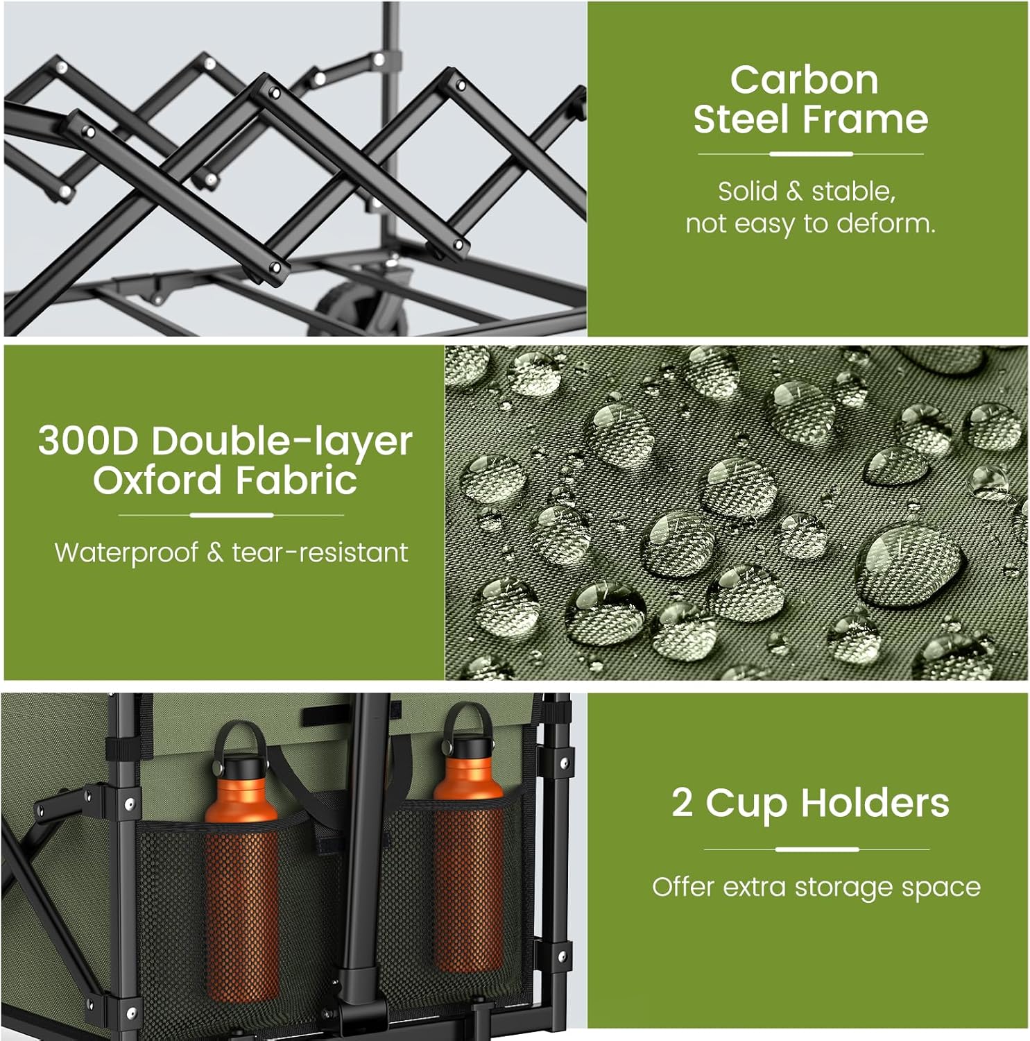 Premium Materials & Sturdy Construction: Made with a high-strength carbon steel frame and high-quality 300D Oxford fabric, this portable wagon is built to last and is water-resistant and scratch-resistant. It can handle harsh weather and heavy loads with ease.