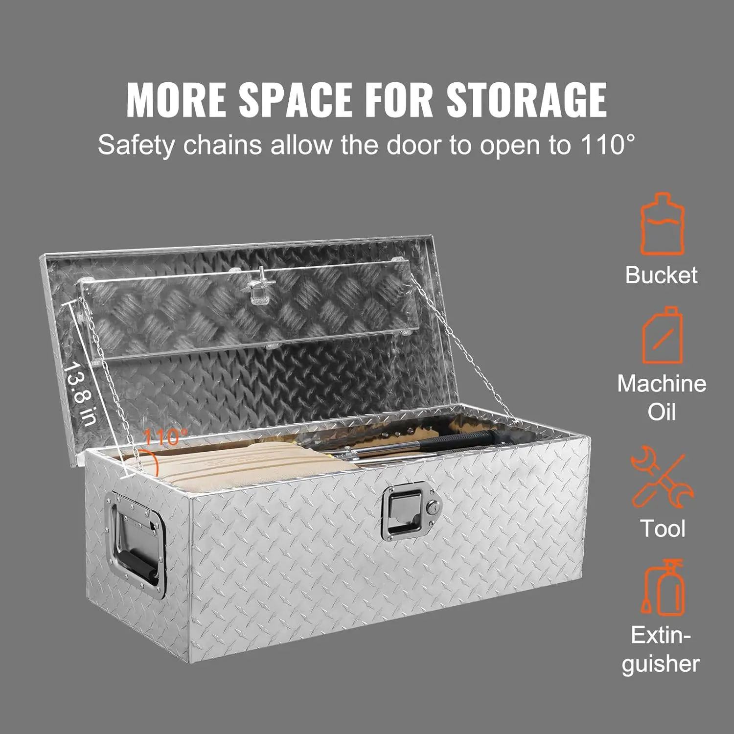 This heavy-duty aluminum truck tool box is designed to provide secure and organized storage for your vehicle. Constructed from durable aluminum alloy with a diamond tread pattern, it features a double-sided powder coating that resists rust, corrosion, and abrasion, ensuring long-lasting performance even in tough conditions. The reinforced corners add extra protection during transport. With dimensions of 30 x 13 x 9.6 inches, this spacious toolbox offers ample room for tools, emergency supplies like fire extinguishers and warning signs, or personal items. It's versatile enough for use in pickups, trucks, trailers, RVs, or at home—keeping everything neatly stored and easily accessible. A key feature is the overhanging door with a tight seal that prevents water from seeping in, keeping contents dry during rain or snow. This makes it ideal for outdoor use where weather resistance is crucial. For security, the box includes a stainless steel locking mechanism with two keys to deter theft. The built-in design also helps minimize impact and scratches while driving, protecting both the box and its contents. Ergonomically designed wider carrying handles on both sides make it easy to lift even with gloves on—comfortable for all hand sizes. Long chains allow the lid to open up to 110 degrees for full access to everything inside without straining. Overall, this tool box combines durability, security, and convenience into one reliable storage solution that can handle years of use across various applications.