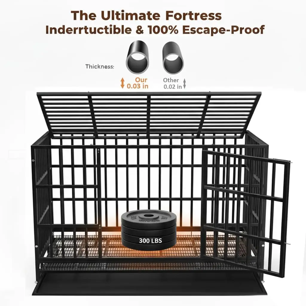 Heavy Duty Dog Crate with Wheels, Indestructible Steel Kennel for High Anxiety Dogs, Double Door and Tray, XL XXL