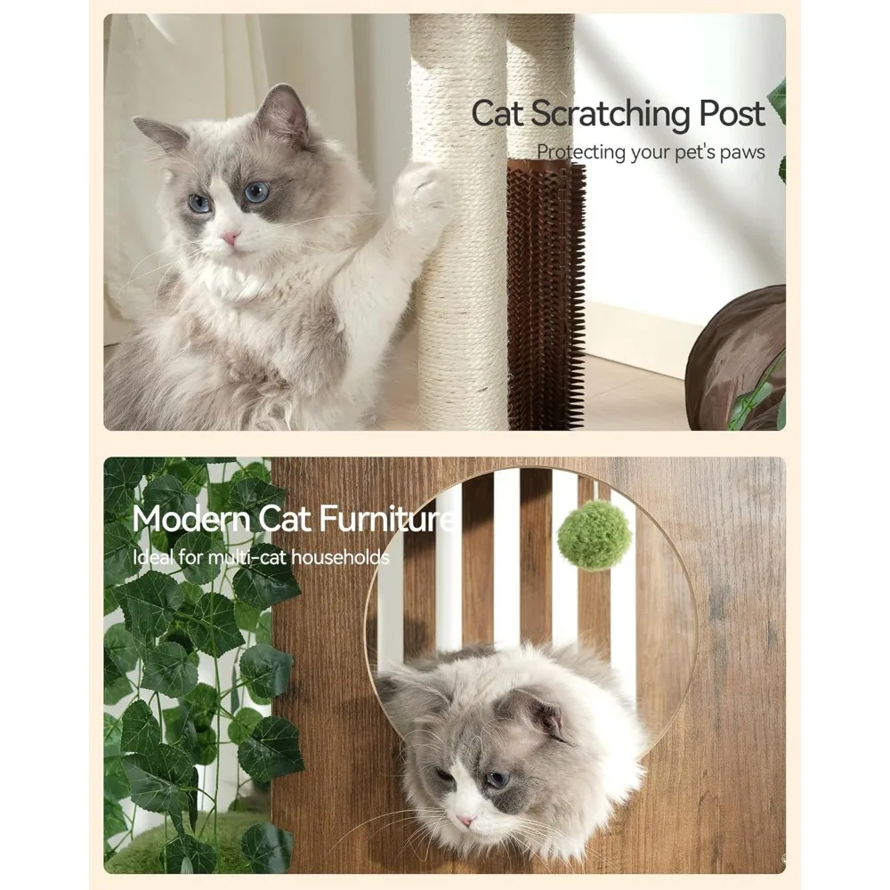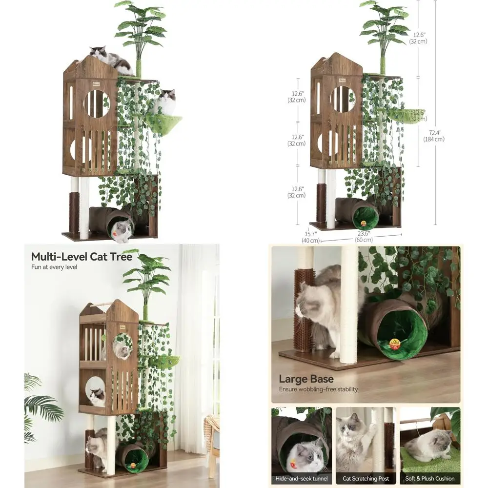 This cat tree is designed in a mid-century castle style with black particleboard and blood-red cushions, creating a gothic atmosphere for your home. It features a sturdy and spacious design with an extra-thick base plate for stability, ensuring it won't tip over during play. The multi-level structure includes climbing posts, platforms, and hiding places to encourage your cat's natural behaviors such as jumping, scratching, and exploring. The layout is spacious enough to accommodate multiple cats, making it ideal for families with more than one cat. The cat tower is covered with lush green plants, hidden tunnels, and hide-and-seek barriers, perfect for cats' natural instincts of hiding, flapping, and exploring. It provides a comfortable hide-out and play area that can keep your cat entertained for hours. Measuring 28.9" x 15.8" x 67", the wooden cat tree offers a large perch and multi-level design for big cats or multiple felines to climb, rest, and play together. The cat tree is made with a durable and easy-to-clean design. It features a scrubbable board veneer platform that is stain-resistant and dirt-resistant, allowing for easy cleaning with a simple wipe. The removable washable cushions make hygiene and maintenance a breeze. The sisal winding post and massage brush design cater to the cat's natural claw grinding and itching behaviors. Assembly is straightforward with clear instructions and all necessary parts included for a quick setup, allowing your cat to start exploring their new gothic fortress right away.