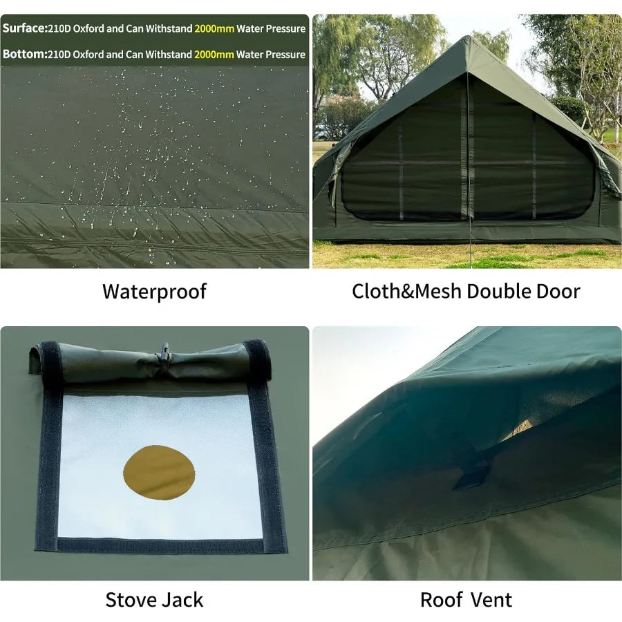 【More Details】The 1 door and 2 side windows are designed with two layers, one layer is airtight and one layer is mesh. The door and windows can be rolled up so you can choose to open them or not depending on your need. Mesh windows and door can enhance the breathability and mosquito prevention. Not only protect privacy but also keep you cool and comfortable on hot summer days. A stove jack allows you to use the stove in the tent. The tent has 1 roof vent for ventilation.
