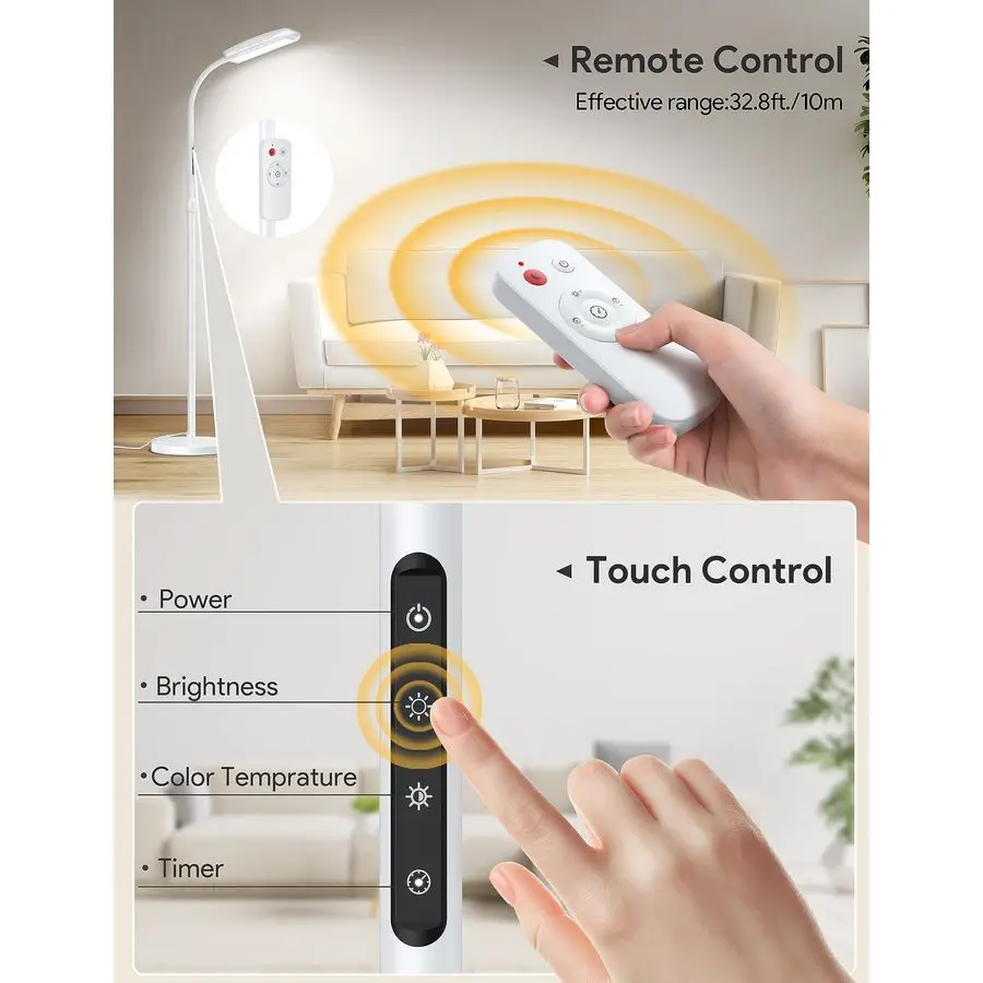 Convenient Remote amp Touch ControlEasily control the sunlight lamp with the included remote or simply use the touch control on the lamp itself.The remote control adopts a magnetic design and can be attached to the floor lamp to prevent loss. Turning on the light therapy lamp is like turning a cloudy day into a sunny day, increasing energy and concentration.
