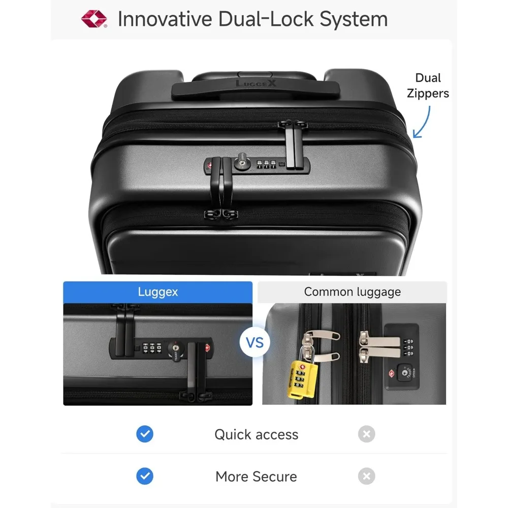 Here's a rewritten product description based on the provided information: This 20-inch carry-on suitcase is designed for travelers who prioritize efficiency and organization. It boasts external dimensions of 22x15x9.5 inches (expanded to 22x15x10.5 inches) and internal dimensions of 18.8x13.9x9.3 inches (expanded to 18.8x13.9x10.3 inches). Weighing 9 pounds, it offers a total capacity of 38 liters (or 42 liters when expanded). The suitcase features a dedicated front compartment for laptops up to 15x11 inches, ensuring secure storage and easy access. Its innovative front-to-rear separation design prevents overlap between your tech essentials and main packing space, providing peace of mind during travel. With a zipper expansion, this carry-on suitcase can instantly increase its packing capacity by 10%, accommodating those extra items you might find during your travels. It's crafted from durable 100% polycarbonate and equipped with smooth 360° spinner wheels for effortless maneuvering. For enhanced security, the suitcase includes a TSA-approved dual-zone lock that secures both the front laptop compartment and the main luggage area. It arrives in eco-friendly packaging, complete with a protective dust cover and guide. The interior is lined with upgraded peach-skin material, providing a silky-soft and scratch-free surface. LuggeX is committed to quality, offering a free 3-year protection plan with this black suitcase. Should you encounter any issues, their dedicated customer service team is available to assist you within 12 hours.