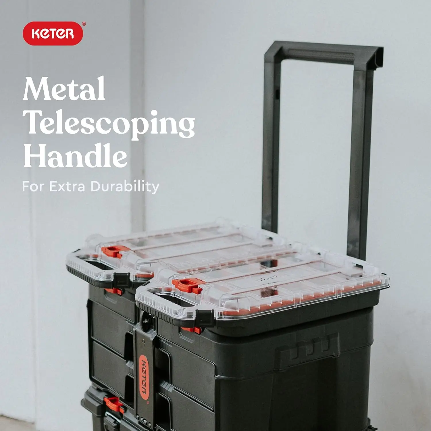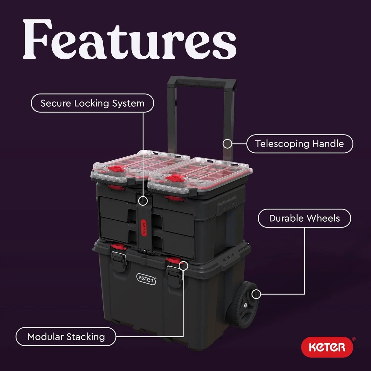 This versatile modular tool organizer system is designed to enhance your garage storage and DIY workspace with practical features that ensure convenience and durability. The set includes four essential components: a large rolling tool box, a two-drawer tool box, and two tray organizers, providing ample space for organizing small parts, tools, and accessories. Constructed from lightweight yet durable materials, this system is perfect for home use, offering a sturdy solution that withstands daily wear while remaining easy to move around. The interlocking design allows for customization, enabling you to configure the pieces as needed to create a mobile workshop tailored to your projects. It combines a cart, toolbox, and organizer in one cohesive unit, making it ideal for transporting items between job sites or within your garage. Audible latches snap closed securely, giving you confidence that your contents are protected from spills or accidental openings during transit. For enhanced mobility, the system features a metal telescopic handle and durable 7-inch wheels that roll smoothly over various surfaces. Side grips provide additional control when maneuvering the cart through tight spaces or up inclines. The small parts organizer includes a transparent polycarbonate lid, allowing you to quickly view contents without opening it—perfect for keeping screws, nails, or other hardware organized and accessible. Whether you're tackling home improvement tasks or professional projects on-site, this tool storage solution offers flexibility and reliability. Its black finish adds a sleek look that blends well with any workshop environment. By streamlining organization and portability, it helps save time and reduce clutter so you can focus more on your work.