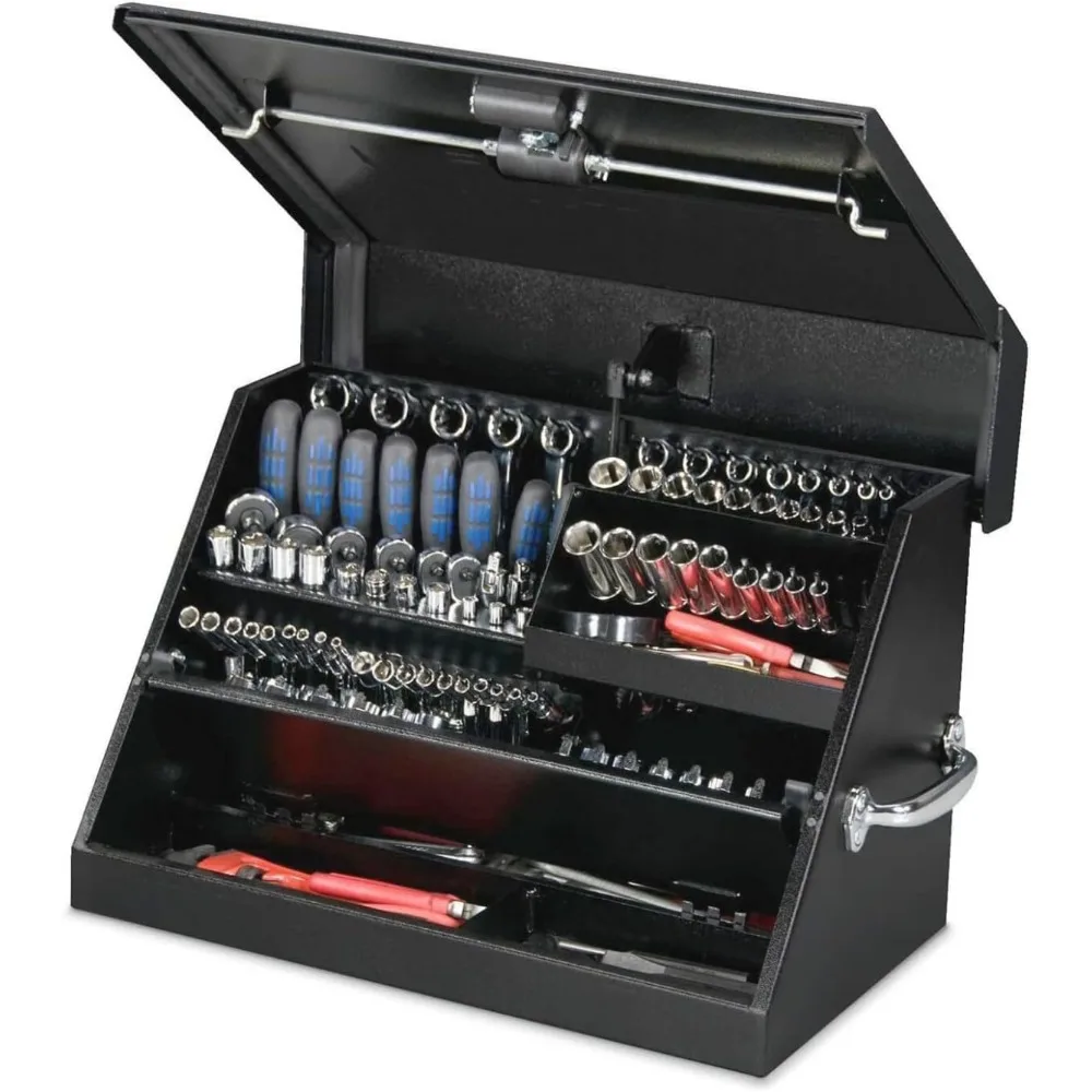 This product is a durable and reliable portable tool storage chest designed for tradespeople who need to protect their valuable tools with long-lasting integrity. The chest features a multi-tiered design that helps keep tools organized, visible, and easily accessible. Made from high-quality steel with professionally welded seams, this heavy-duty toolbox ensures the safety of your SAE or Metric tools and extends the life of the storage chest. It comes with a gas shock mechanism that lifts the lid when unlatched, making tool storage convenient. The toolbox is weather resistant, with a water-resistant seal on the lid to protect your tools from dust and moisture. The construction is made from 16-gauge steel with welded seams, not spot welded, and the lid securely holds tools in place when closed. Additional features include a gas spring for easy access when the lid is unlatched, dimensions of 22.5 inches in width by 13 inches in depth by 14.125 inches in height (expanding to 26.75 inches in width when the lid is open), and a limited lifetime warranty is provided, with tools not included.