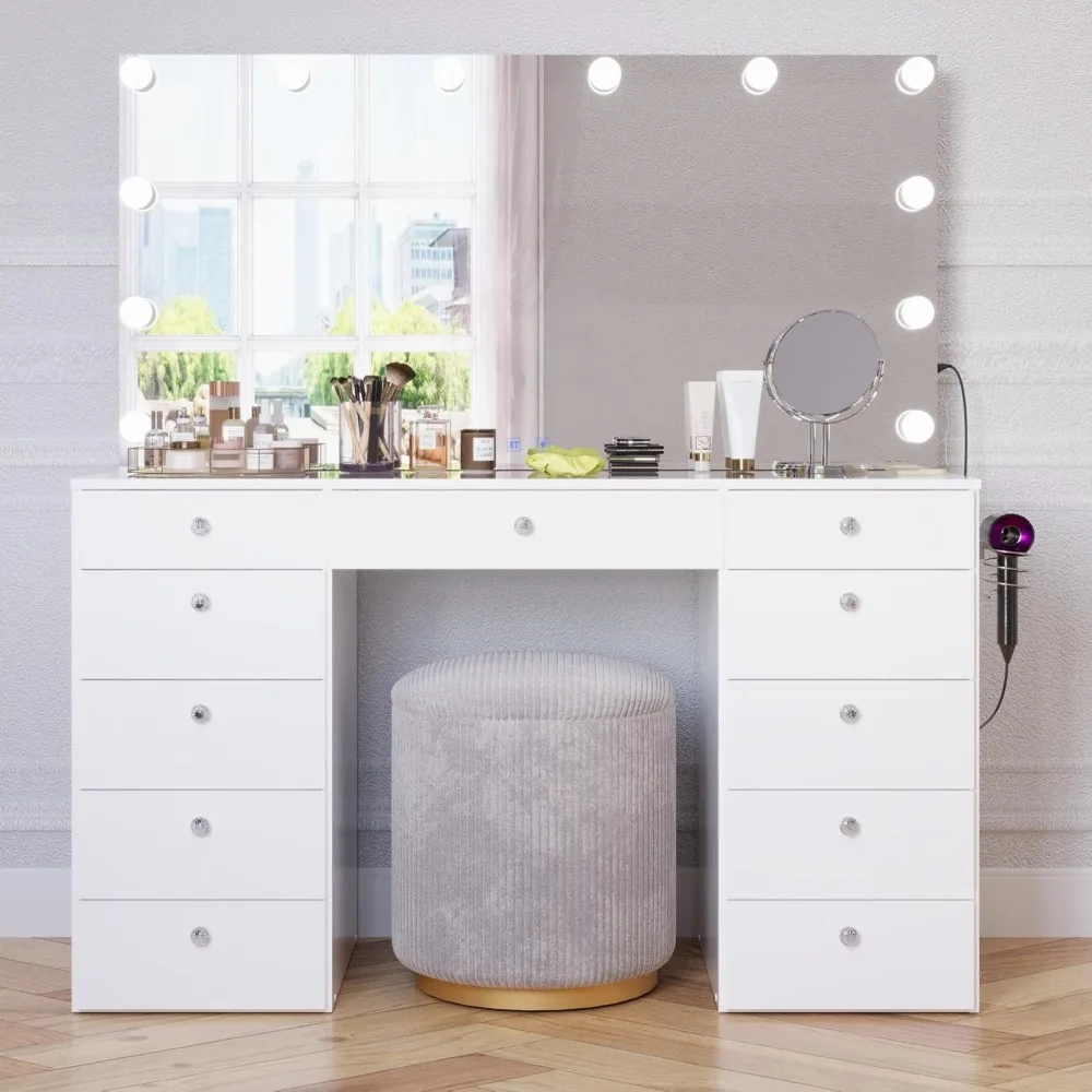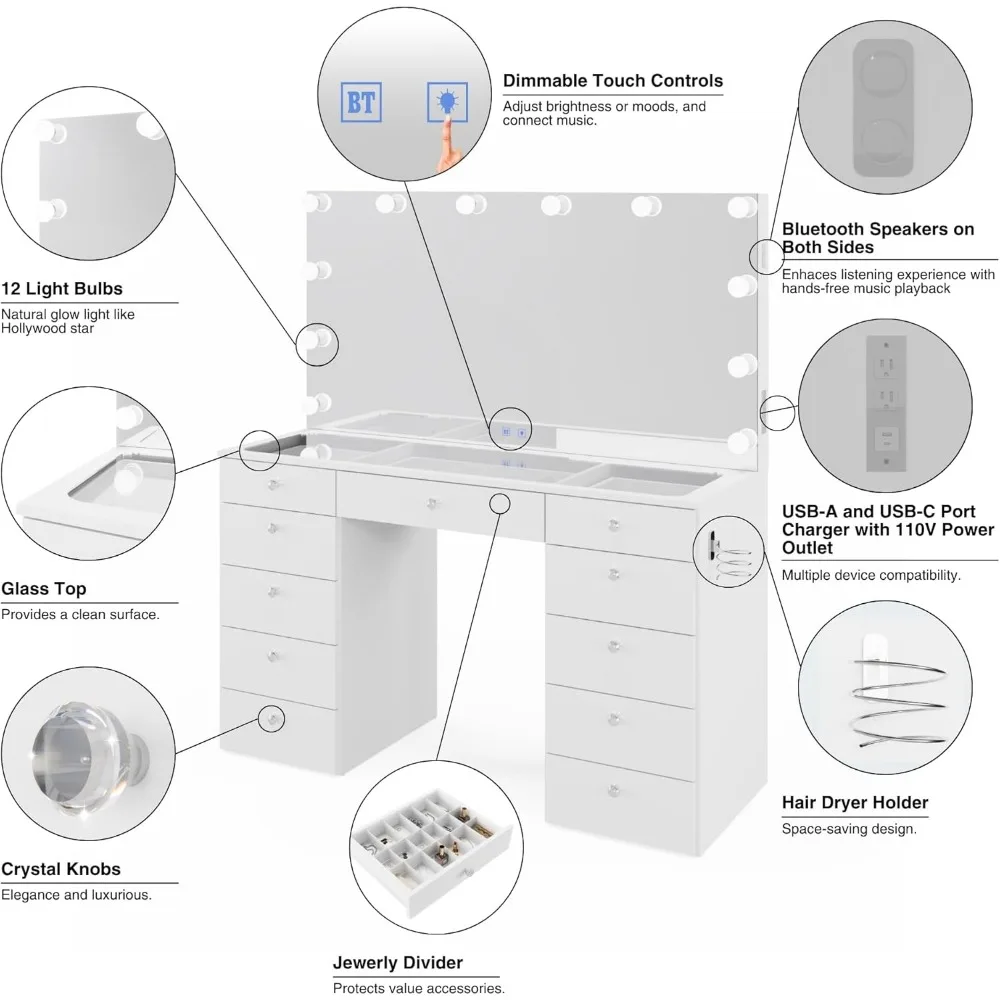 Orla - Glass Top Large Vanity Desk w/Bluetooth Speaker, 12 Hollywood Lights, 11 Drawers, Crystal Knobs, USB Type-C & Type-A Por