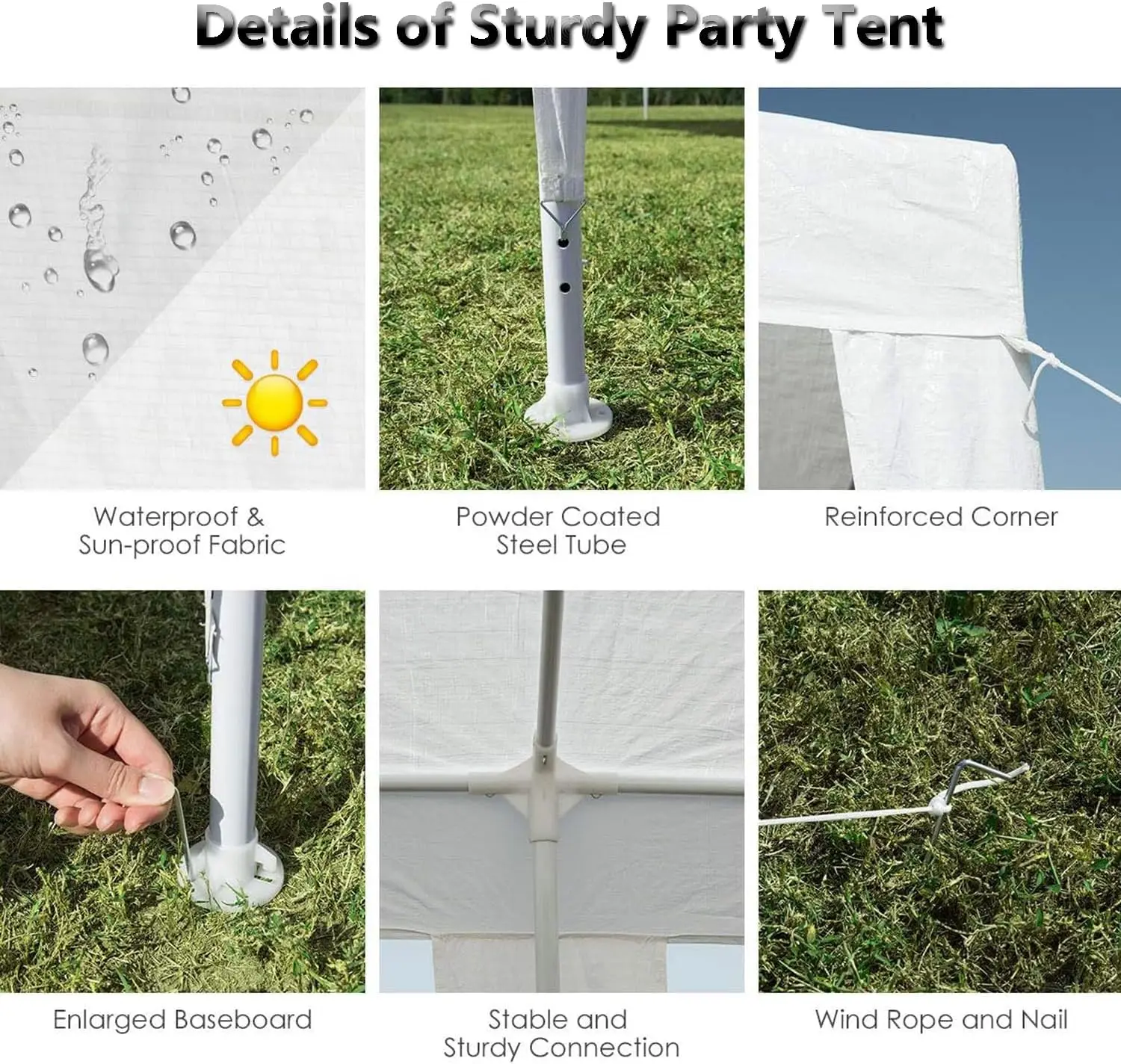 - SELECTED MATERIALS: The canopy is made of PE cloth, which is water and UV resistant. And have rust & corrosion resistant, white powder coated iron framework to ensure the white party tent sturdiness and stability. Our tent uses threaded pipe connection to offer stronger support. Canopy tent with walls equipped with ground pegs and ropes for added Stability. Perfect for family dinners and weddings