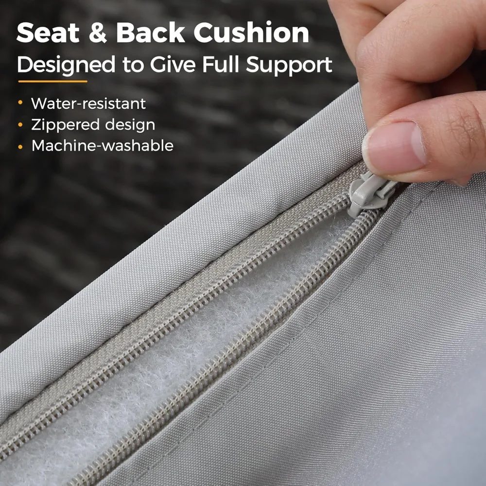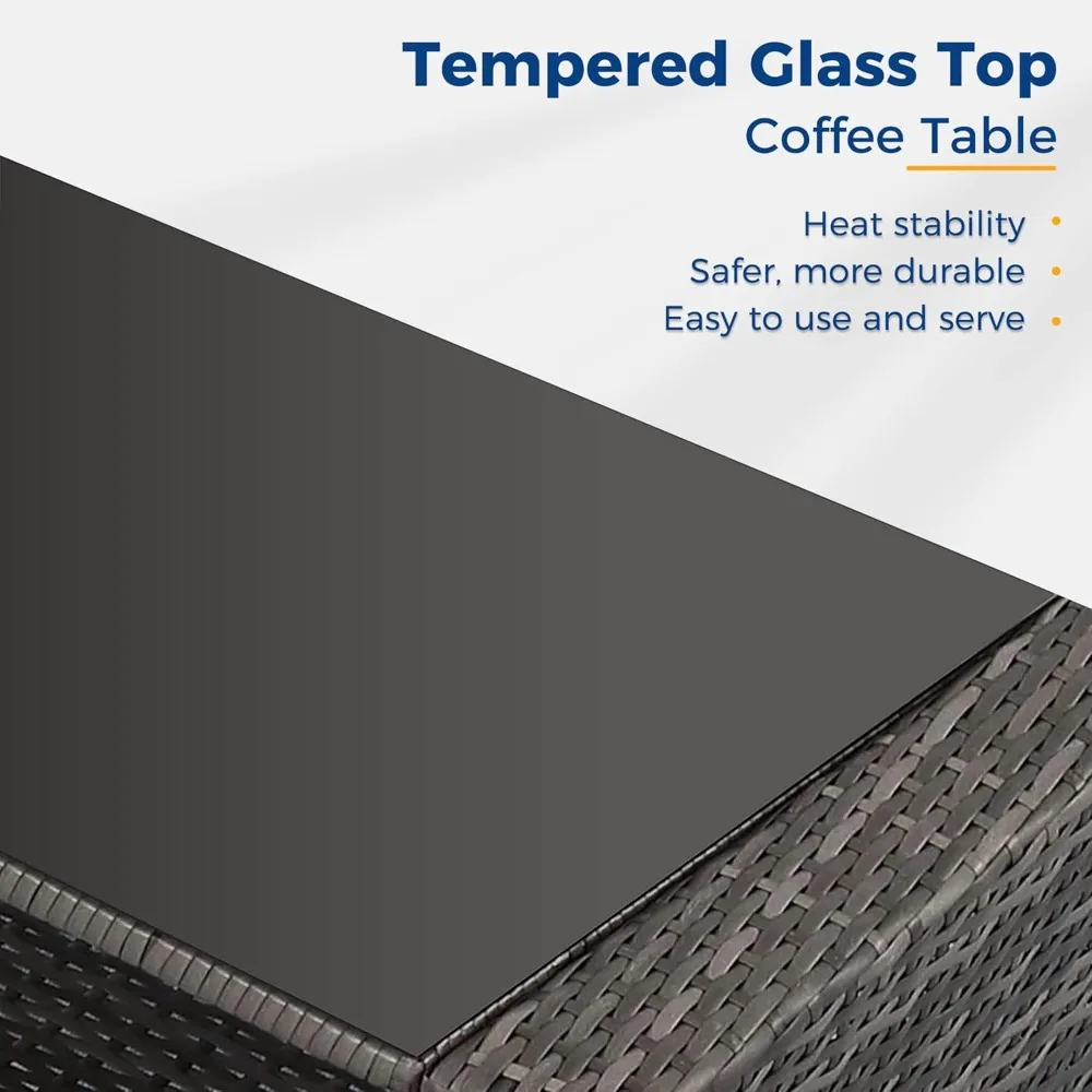 This 4-piece outdoor patio furniture set is crafted with premium PE rattan and a sturdy powder-coated steel frame, ensuring durability and reliability in any weather condition. Ideal for balconies, lawns, gardens, or poolsides, this set is perfect for all outdoor spaces. The set includes comfortable seating with 3-inch seat back cushions and ergonomic backrests, designed for optimal support and extended relaxation outdoors. Maintenance is easy with removable cushion covers and splash-proof materials. The tempered glass top of the coffee table is simple to clean with fresh water. The versatile sectional set allows for flexible configuration, adapting to different room sizes and creating your desired outdoor seating arrangement. The complete set consists of a loveseat measuring 48" x 26" x 30.3", two armchairs measuring 28.4" x 26.4" x 30.3", and a coffee table measuring 34.3" x 19.7" x 13.8", all packed in two boxes.