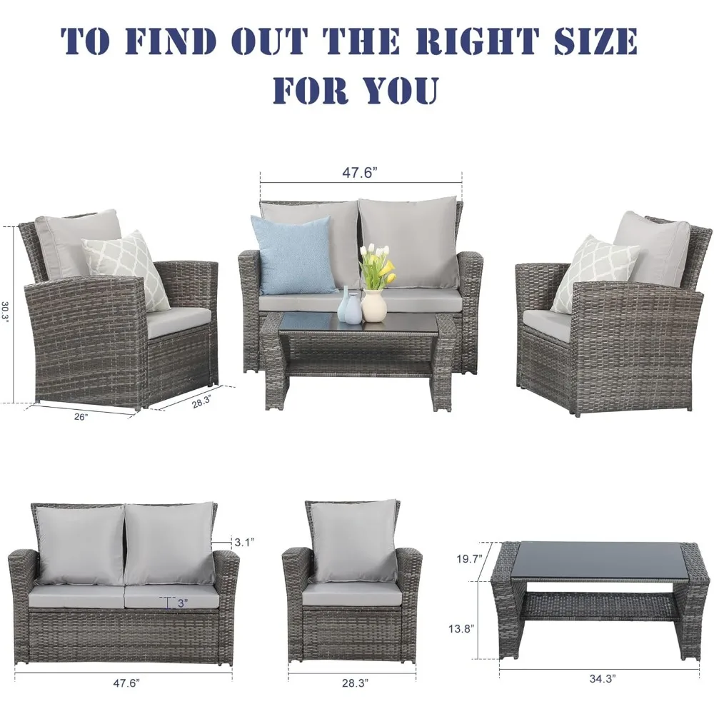 Outdoor Patio Furniture Set, 4-Piece Wicker Conversation Set with Gray Rattan Sofa Chairs and Cushions for Porch or Deck