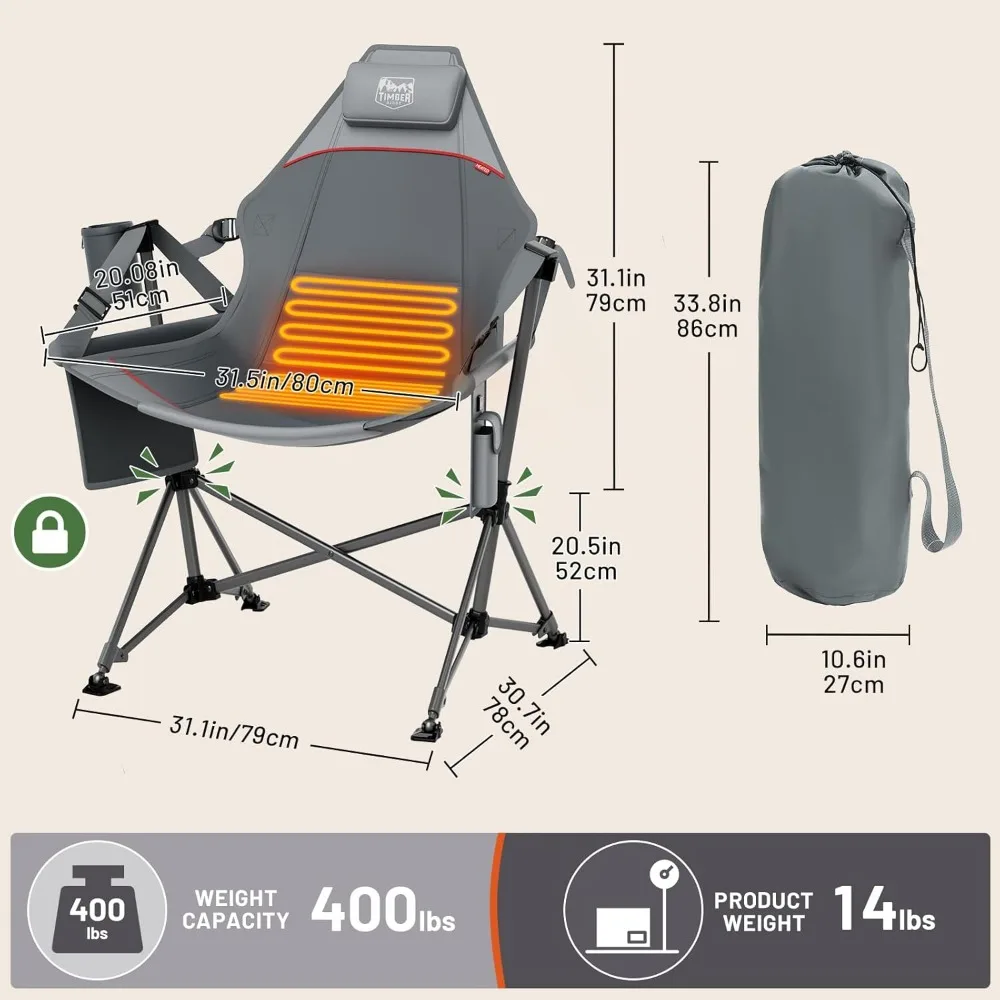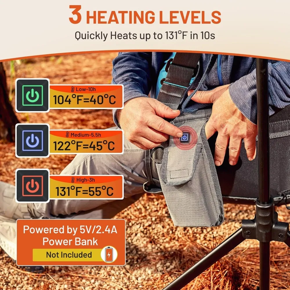 This product features a dual-zone heating system that quickly warms both the back and seat area, reaching temperatures up to 131°F in just 10 seconds. It offers three heat settings (95°F, 113°F, 131°F) to provide lasting warmth for any outdoor event. The padded chair is designed to circulate heat, keeping you comfortable even in cold weather, making it ideal for extended outdoor stays or sporting events. The chair boasts an oversized comfort with a seat width of 31.5" and a back height of 31.1", supporting up to 400 lbs and measuring 31.1" x 30.7" x 42.1" when open. It offers customized support with an adjustable backrest and seat height, providing a 20.5" ground clearance for optimal legroom, along with a padded seat and headrest for enhanced outdoor relaxation. The chair is easy to set up and fold with a sturdy steel frame and an automatic locking system. Ensure it's secure by listening for the "click" sound and remember to remove the protective cotton before use.
