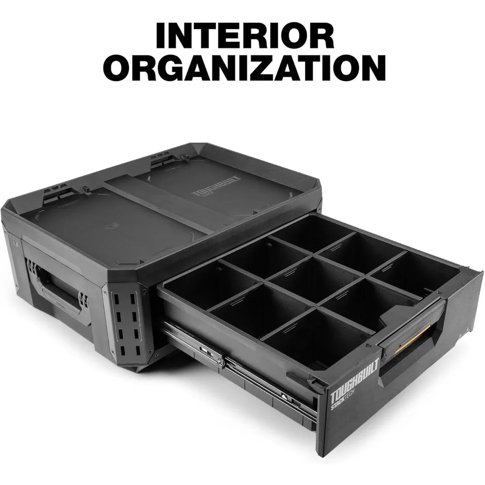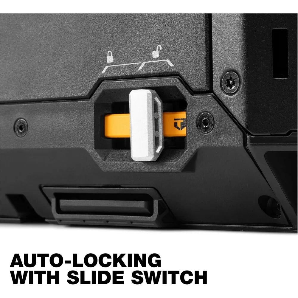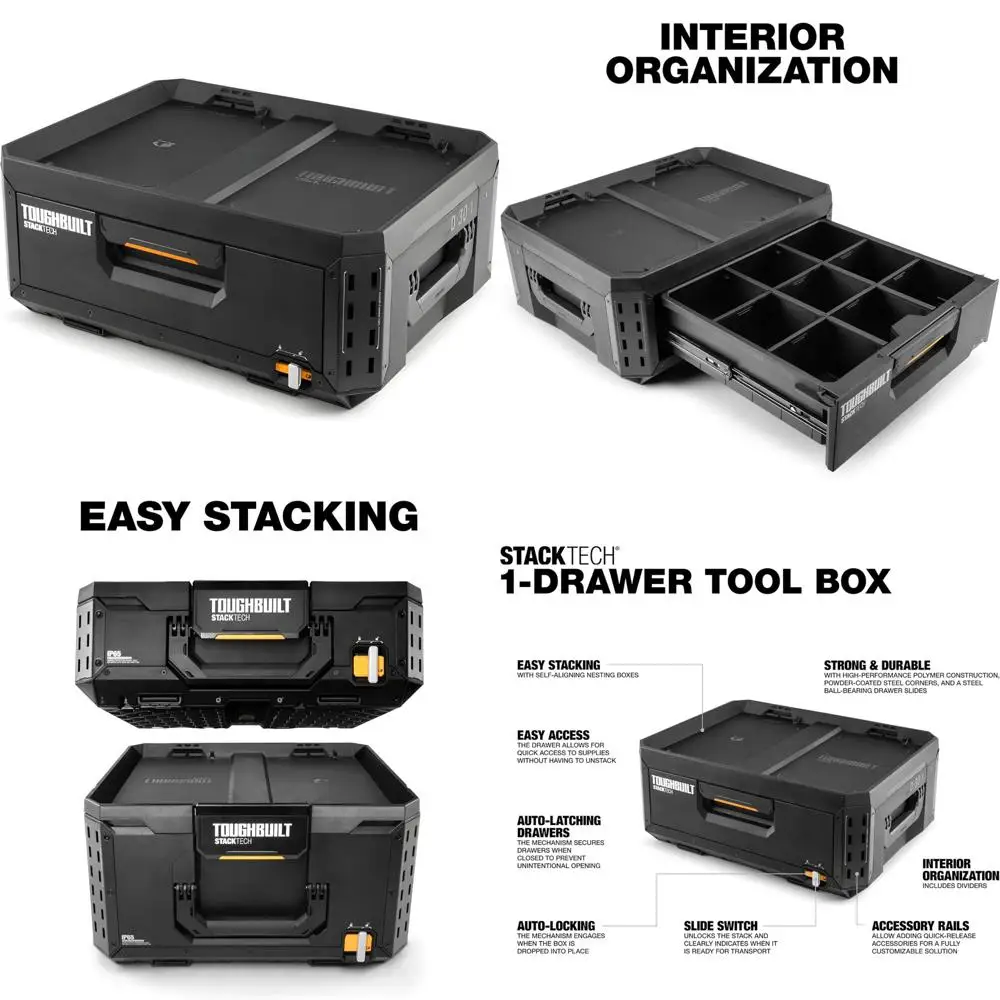 This product features convenient stacking capabilities with its self-aligning nesting boxes and an auto-latching drawer system that ensures drawers remain securely closed to prevent accidental opening. The auto-locking mechanism activates when the box is set in place, allowing for swift access to stored items without the need to dismantle the stack. A slide switch is integrated to unlock the stack and provides a clear visual indication of its locked status, making it ready for transportation. The accessory rails enable the attachment of quick-release accessories, offering a customizable solution and including dividers for enhanced interior organization. Constructed with high-performance polymer, reinforced with powder-coated steel corners and steel ball-bearing drawer slides, this item is both robust and long-lasting.