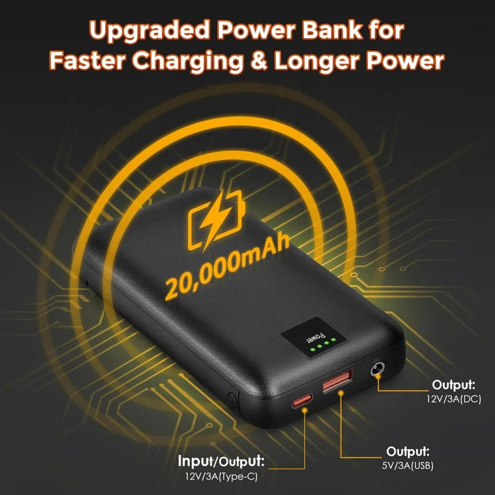 This product features a durable double 600d Oxford fabric construction. It's an upgraded heated moon chair equipped with two built-in heating zones and a 20000mAh rechargeable power bank, designed to provide consistent warmth for your back, seat, and sides, making it ideal for outdoor adventures in cold weather. The chair offers advanced 3-level dual heating zones, with three temperature settings (low, medium, and high) to cater to your personal comfort. The dual control buttons allow you to adjust the temperature for the back and seat separately, using an upgraded heating coil that heats up smarter, faster, and hotter, ensuring safe and penetrating warmth. For ultimate comfort and portability, the chair is padded with premium upright cotton for exceptional comfort and back support. It includes fully padded armrests, a high backrest, and a 110° cozy heated seat. The chair folds down to a compact size of 38" x 7" and comes with a carrying bag for easy transport. Thoughtfully designed, the heated camping chair includes a battery storage bag, two large mesh pockets, and two cup holders, providing convenient storage for your belongings while freeing up your hands during outdoor activities. The chair is made with premium materials, featuring 1mm thick square tubes and double-layered 600D Oxford fabric for strength, durability, and breathability. It has a maximum load-bearing capacity of 500LBS, but for longevity, it's recommended not to exceed 330 lbs. The chair is convenient and practical, requiring no assembly and folding quickly for easy storage. It's suitable for all seasons and enhances the outdoor experience in various settings, including lawns, gardens, porches, and balconies. It comes with a 2-year warranty and a 30-day return and refund guarantee, with customer support available for any inquiries.