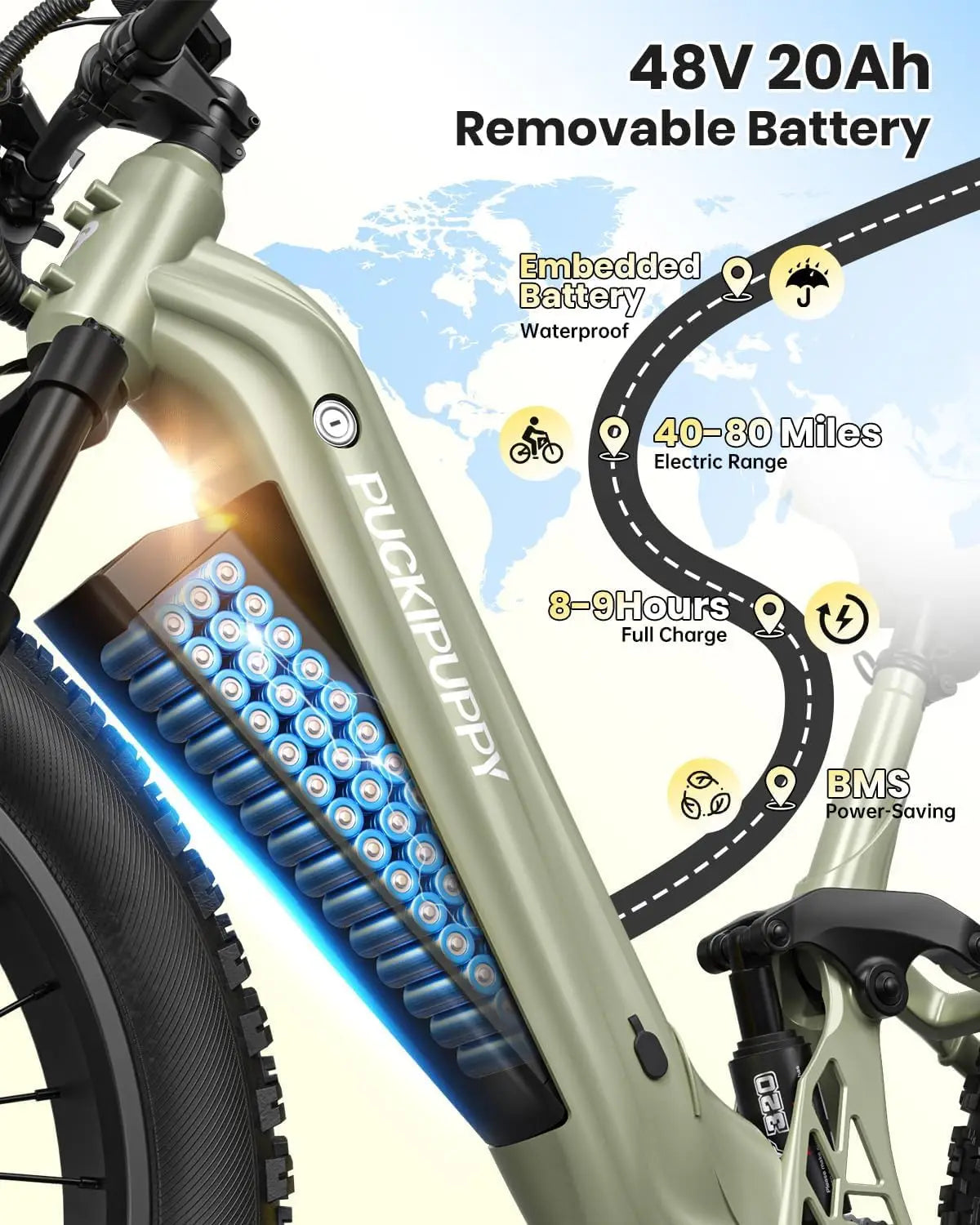 PUCKIPUPPY Boxer-ST Electric Bike 960W 48V 20AH Electric Bicycles 26" x 4" Fat Tire Full Suspension Ebike with 2-Year Warranty