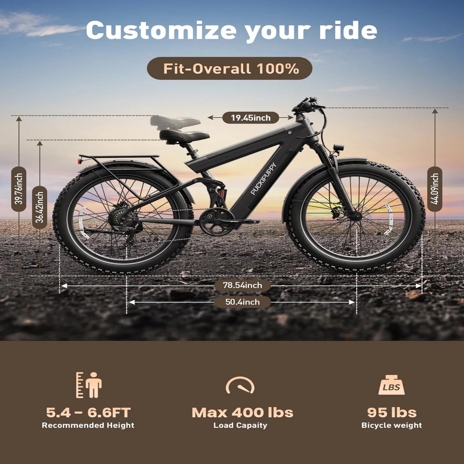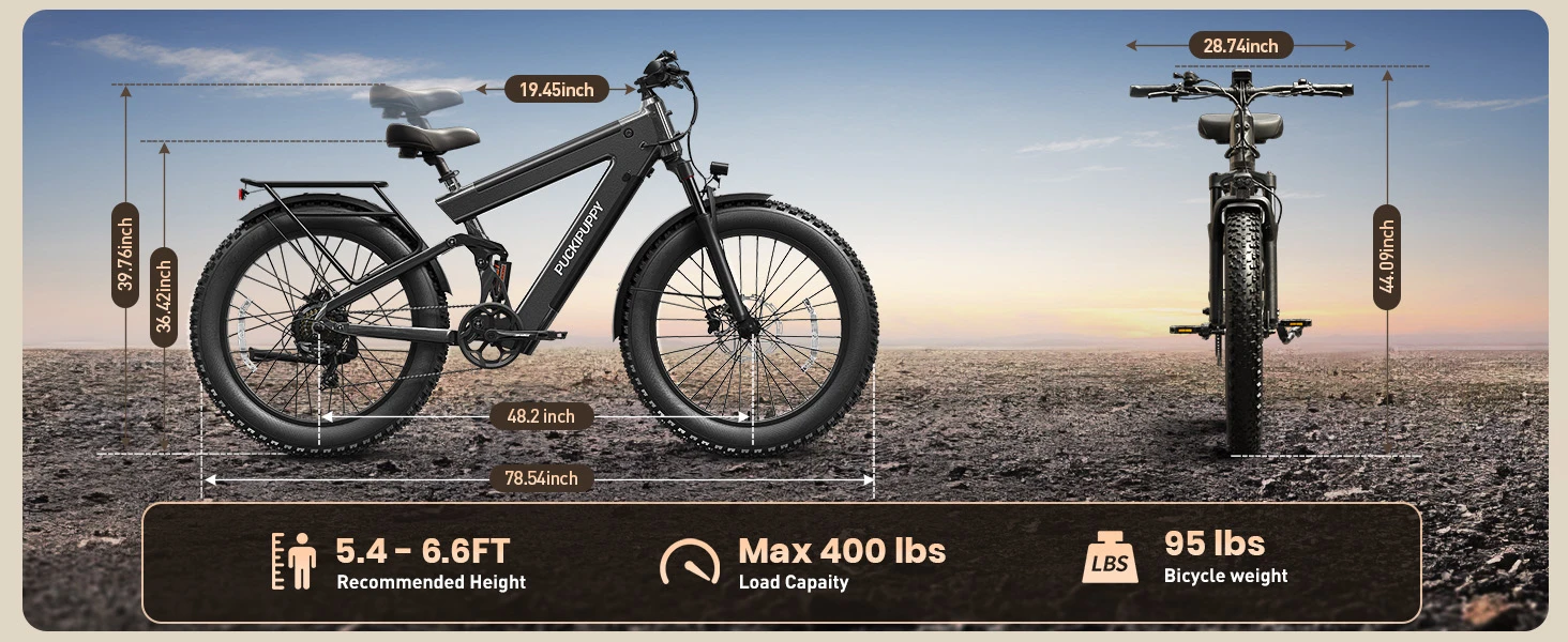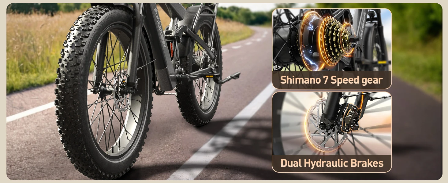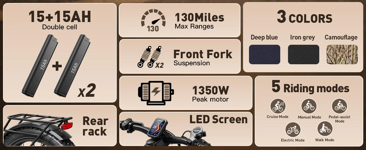 About this item 【Longest-Range Model - Bulldog】Range of up to 130 miles with a robust 30Ah battery, dual batteries add weight while enhancing riding stability. 26x4-inch fat tires, 7-Speed gearing, 5 Ride modes, longitudinal all-suspension system, built for adventure and comfort across any terrain. Whether you commute in the city, explore the forest, or enjoy the fresh air of the open road, join us for the ultimate ride and pursue the most precious freedom!