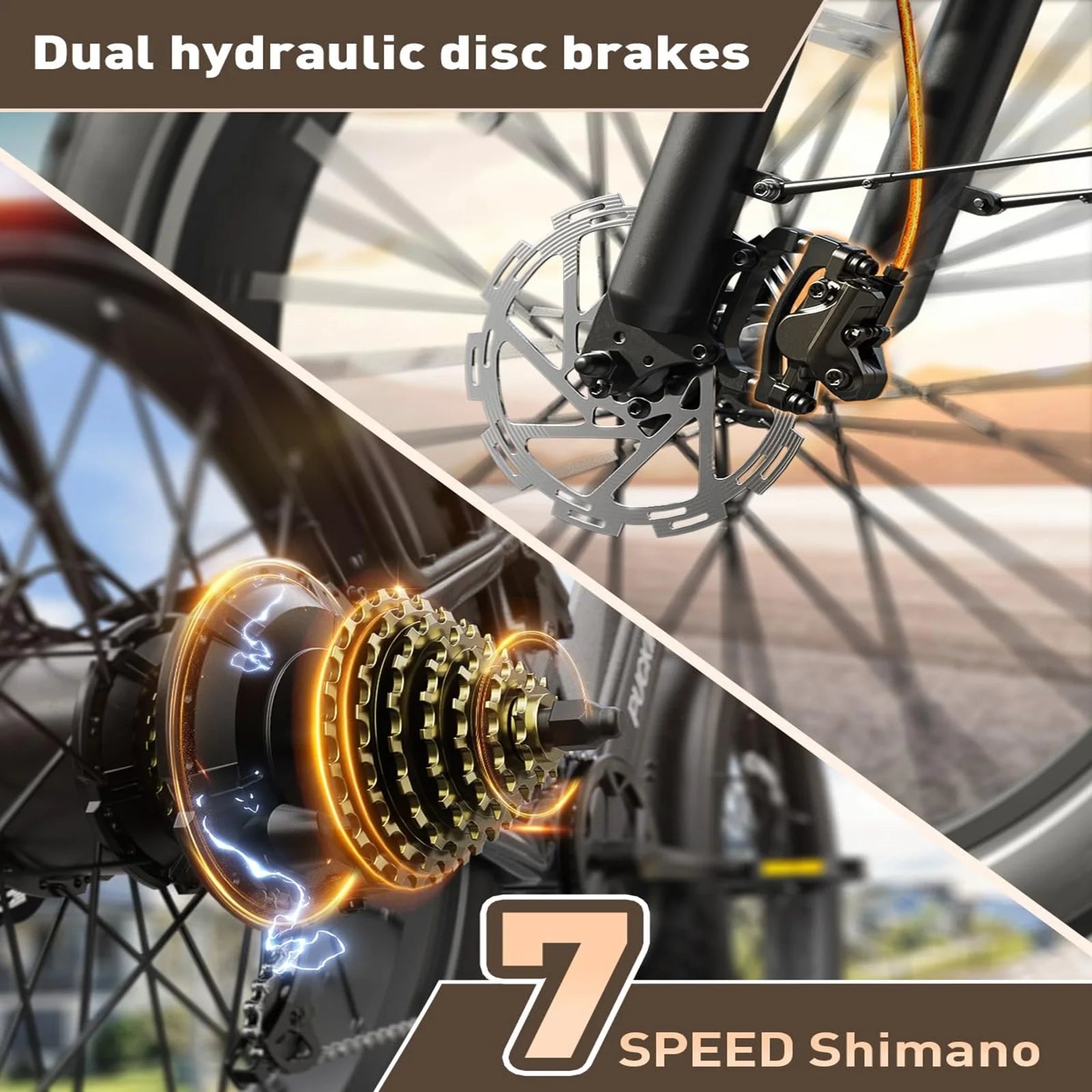 【Longitudinal Suspension & Hydraulic Disc Brakes】The concealed longitudinal suspension extends lower into the frame, providing a greater suspension angle and improved cushioning. It reduces bump impact by 85% for a safer, faster, and more stable ride. Hydraulic brakes ensure safe stops in all conditions: rain, off-road, and downhill.