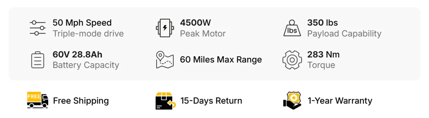 【60 Miles Long Range】 60V 28.8Ah battery, X1 Spark electric bike brings long range reach 60 miles! (Note:In pedal assist mode.The range varies depending on road conditions,riding mode,weather,rider weight,battery level value, etc.). Whether you're exploring rugged trails, commuting on a daily bike ride, or sailing on challenging hills, this electric bike provides reliable performance for your next adventure with a charging time of 7-8 hours.