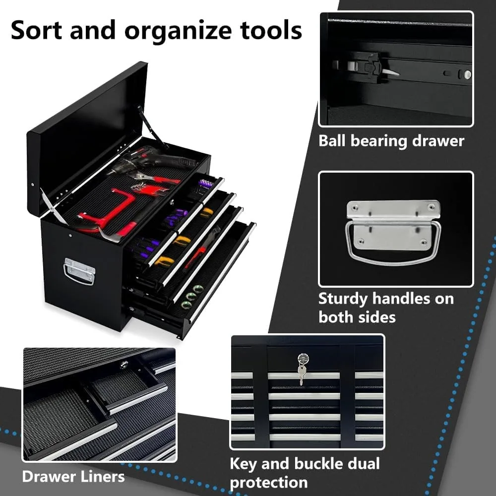 - 【Easy Mobility & Storage】Featuring 4 universal casters (2 braked) and 2 handles on the top box, rolling tool chest can be effortlessly moved and stored wherever needed. The top box conveniently fits into the bottom cabinet for space-saving storage when not in use.