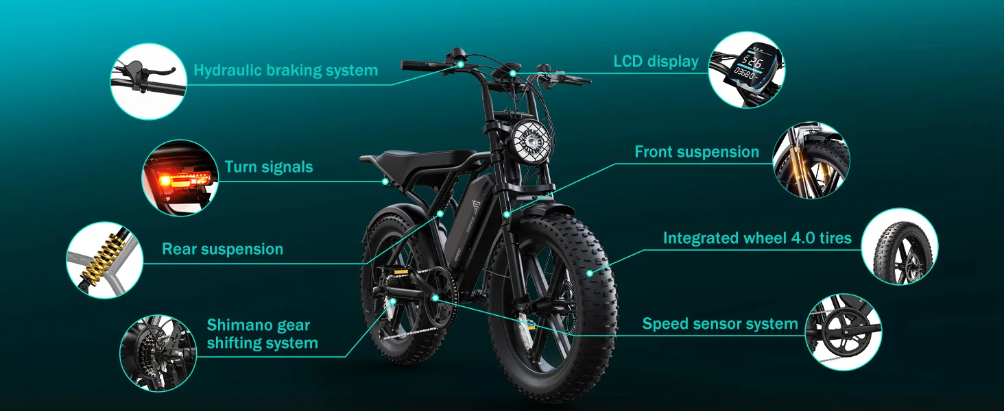 𝗠𝘂𝗹𝘁𝗶𝗽𝗹𝗲 𝗿𝗶𝗱𝗶𝗻𝗴 𝗺𝗼𝗱𝗲𝘀: This fat tire electric mountain bike can switch between pure electric, electric assist and pedal modes. In pure electric mode, you can use the motor and throttle as needed. The auxiliary power mode moderately increases the rider's pedal power based on the speed sensor, which is very suitable for riding in different terrains, especially for reducing physical exertion when climbing. The pedal mode functions the same as a traditional bicycle