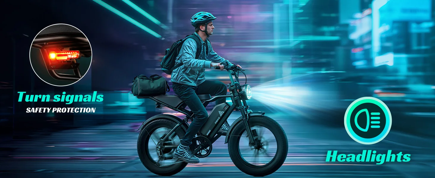 𝗔𝗹𝗹-𝘁𝗲𝗿𝗿𝗮𝗶𝗻 𝗖𝘆𝗰𝗹𝗶𝗻𝗴 𝗦𝗮𝗳𝗲𝘁𝘆: This electric dirt bike is equipped with 20"x4.0" puncture-proof wide tires and dual mechanical disc brakes. The enhanced traction and sensitive braking system ensure excellent handling and safety in all weather conditions. 360°LED lighting (headlight/brake light/turn signal) ensures clear visibility at night. The full suspension system absorbs bumps and can easily handle various road surfaces from city streets to rugged trails